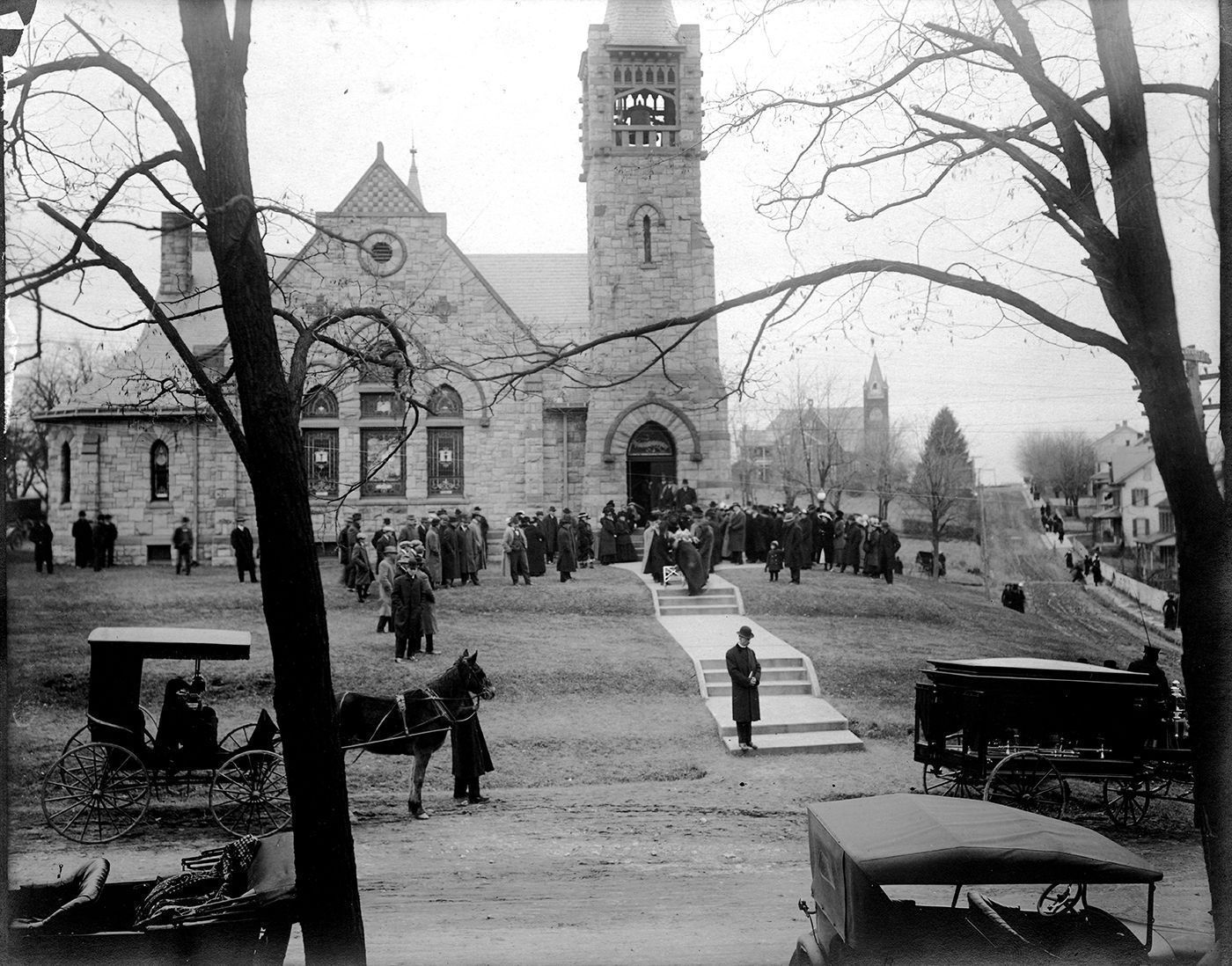 Print, photographic. B/W photograph of the funeral of William F. Brown, held at St. Mary's Lutheran Church, Silver Run, January 5, 1916. Taken from across Littlestown Pike, looking toward the church. A hearse is parked on the road, mourners are gathered on the lawn in front of the church. View looks down Mayberry Road; St. Mary's U.C.C. church visible in background. Written on back: "Silver Run, Maryland Funeral of Brown, husband of Esther Kaufman." 8" x 10".Acquisition