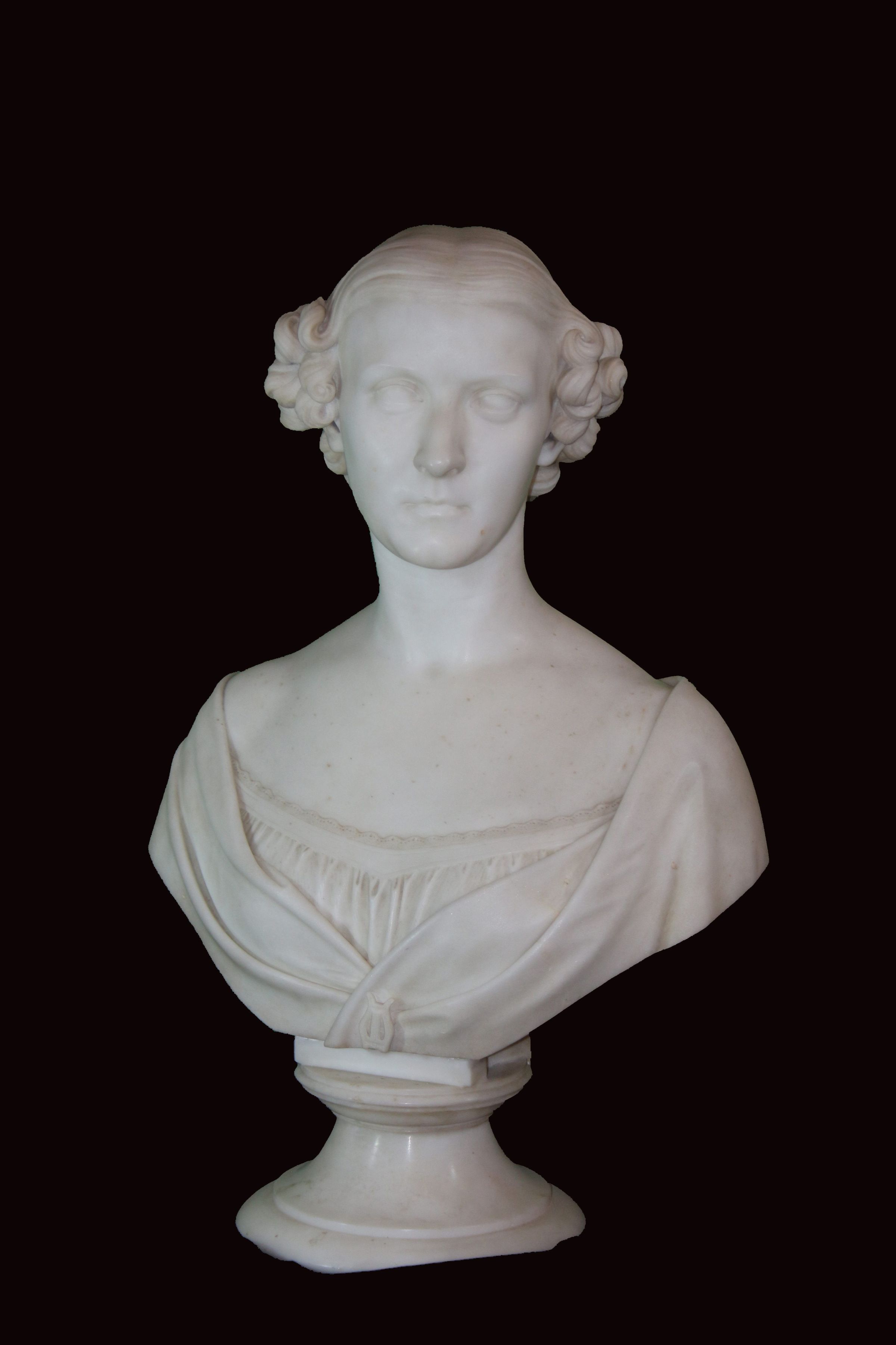 Bust, 1860, marble. Original sculpture of Sarah Matilda Robertson Mygatt; very classical style; subject has head turned slightly to her left; wearing loose off-the-shoulder gown. 24"h x 15"w x 8"d.General Notes