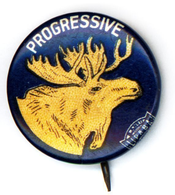 Button, political..875" diameter, metal button. Blue background with profile of a moose in gold. Across top is "Progressive" in white capital letters. Refers to "Bull Moose" party that Teddy Roosevelt formed in 1912 to run against William H. Taft, his former protégé. Instead, Woodrow Wilson won the presidency.General Notes