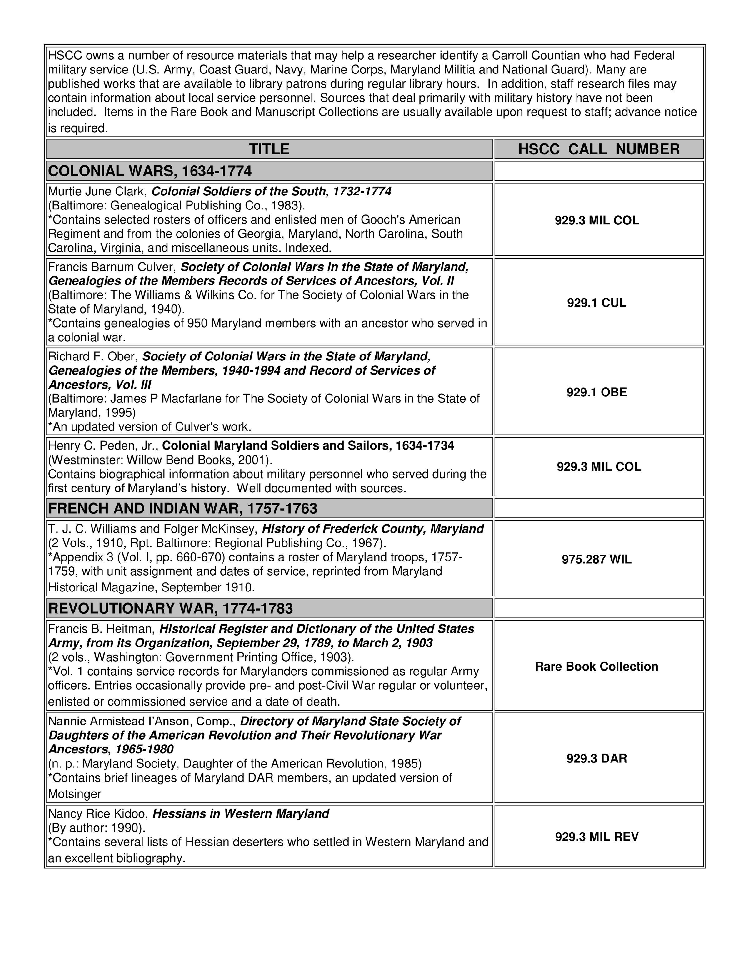 HSCC owns a number of resource materials that may help a researcher identify a Carroll Countian who had Federal military service (U.S. Army, Coast Guard, Navy, Marine Corps, Maryland Militia and National Guard). Many are published works that are available to library patrons during regular library hours. In addition, staff research files may contain information about local service personnel. Sources that deal primarily with military history have not been included. Items in the Rare Book and Manuscript Collections are usually available upon request to staff; advance notice is required.