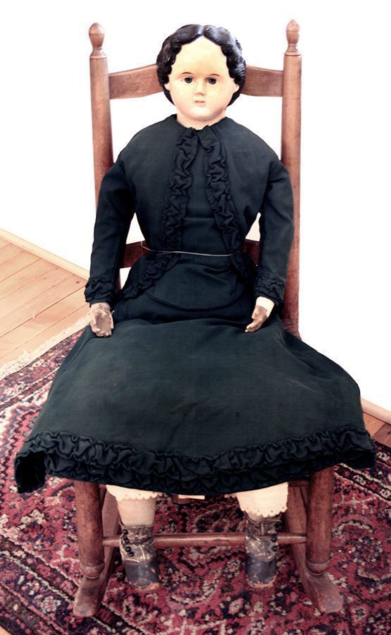 Doll. Made by Ludwig Greiner. 34" tall. Papier mache doll head, painted face, blue eyes, black hair. Cloth body. Leather high button shoes. Green dress; skirt with 2 tiers of ruffles at hem; bodice designed to look like jacket and blouse with ruffles along jacket opening, back button closure; white cotton drawers and petticoat. Paper label on back of neck reads "GREINER'S PATENT DOLL HEADS No. 13 Pat. March 30 '58, Ext. '72".Acquisition