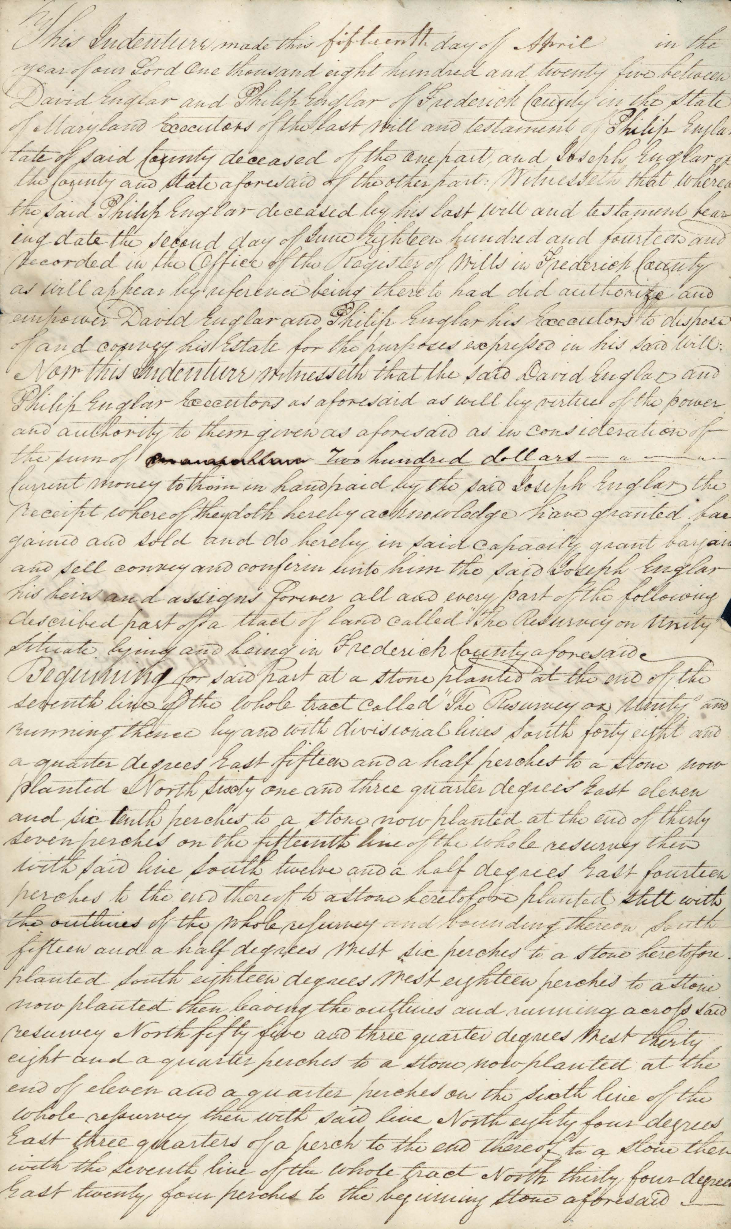 Original deed of gift reads "1825 deed David Englar & Philip Englar"; executors for Philip Englar deceased, transfer of land to Joseph Englar.Acquisition