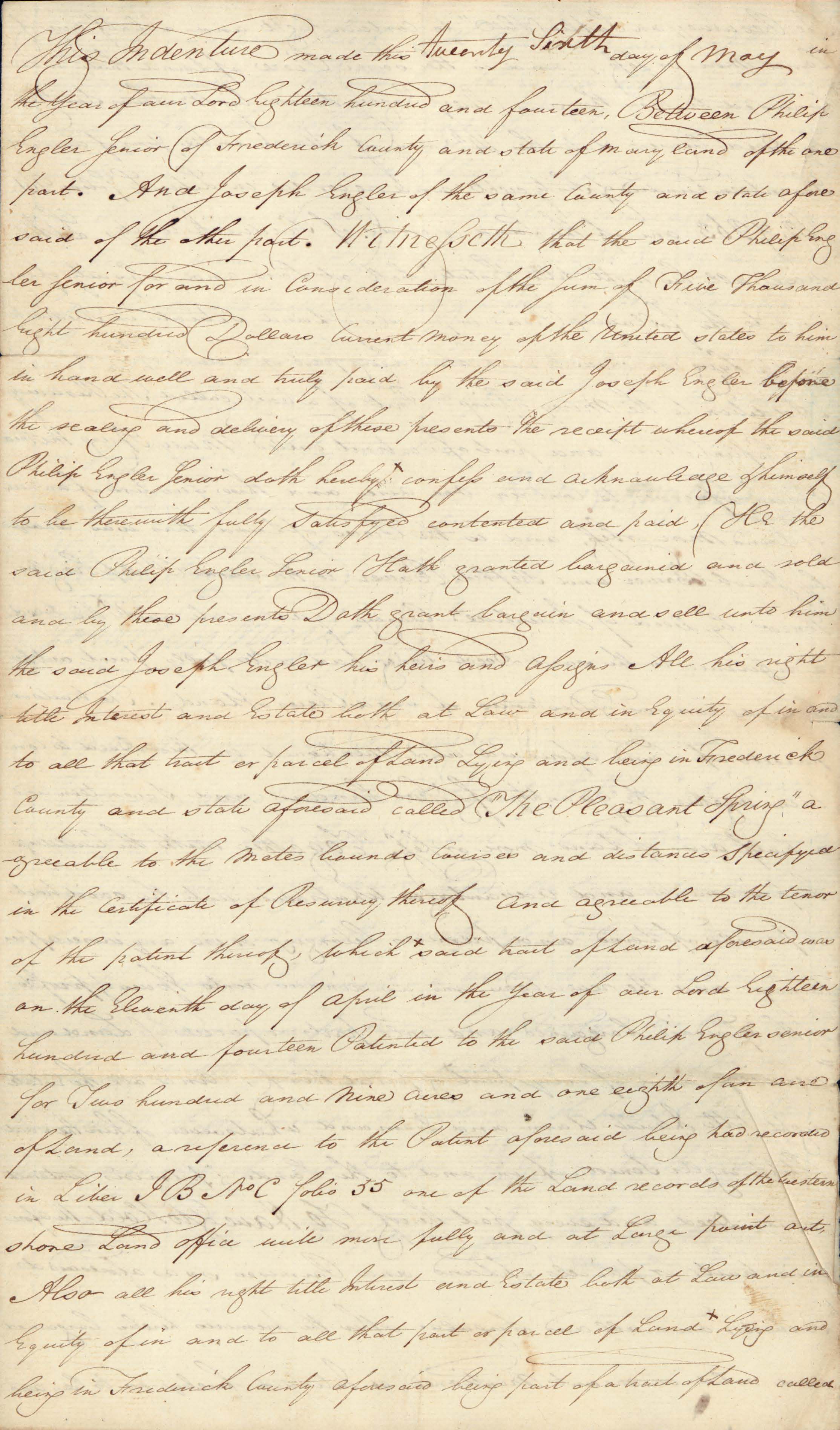 Original deed of gift reads "1814 deed Philip Englar to Joseph Englar"