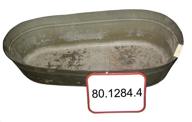 Bathtub. Tin, ovoid, painted gray. Wire handle on each end, rounded rim, indented ring around tub near top. 9"h x 36"w x 18"d.Acquisition