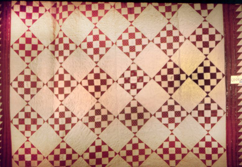 Quilt. Friendship quilt. 97" x 100.5". Pieced quilt constructed of 36 red and white patchwork blocks alternating with 25 white blocks; blocks are 10". White blocks decorated in trapunto with quilted stuffed flowers in different designs. 4.5" border has red and white sawtooth pattern. Edged with red print binding that is folded over back and front and then handstitched. Backed with white cotton. Inscribed "1842-1846 Near Taneytown April 18,1842". Names of the women who made the quilt appear on the squares. Inscriptions are: "Jane Nunemaker Emmitsburg, Md."; "Susan G. Wolff Easton, Pa, May 1842"; "Alice A. Fleming Frederick, Md. 1842"; "Mary Galt October 1st, 1842"; "Mary Knox 1846"; "Henrietta M. Boyle Taneytown Jan'y 24, 1843"; "Evalina Shaw Taneytown, Md. April 29 '42"; "Elizabeth Thomson Taneytown, Md."; "Sarah Galt October 1st 1842"; "Jane R. Fleming, Frederick, Md. 1842"; "Mary Ann Thornton February 12th 1846"; "Jane Nunemaker Emittsburg, Md."; "Mrs. Sarah Galt August 1842"; "Sophia Cromwell Taneytown, Md. April 23, 1842"; "Evalina S. Leader Taneytown, Md. April 29, 1842"; "Sophia Agnew Feb. 12, 1842"; "Mary D. Galt Aug. 31st. 1842"; "Maria Leader April 29, 1842"; "Ann Margaret Febr. 12th 1846 (Grier)"; "Harriet Flemming March 10th 1845"; "Nancy E. Galt September 1842"; "Jane B. Mcallister, near Taneytown April 15, 1842"; "Mary I. Thomson Taneytown, Md."; "Mary T. Swope September 1842 Taneytown"; "Sarah Wallace Baltimore, Sept. 1842"; "Ursual Galt Oct. 1st 1842"; "Annan Grier Feb. 12th 1846"; "Catharina E. Galt August 16th 1842"; "Rebecca Clauss Feb. 12, 1846"; "Mary M. Motter 1846".Acquisition
