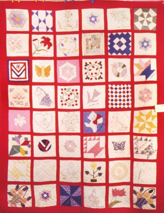 Quilt. Friendship quilt, 1942. 70.5" x 90". Composed of 48 9" blocks each made by a different seamstress. Made of pastel cotton fabrics; pieced, appliquéd and embroidered; each block outlined by 2" red border. 4" red border with decorative stitching. Edged by bringing back to front and handstitching. Backing is white cotton. Quilt is dated 1942. Names on quilt include: Margaret Senft; Mary Louise Arbaugh; Ida Leese; Marguerite Arbaugh; Anna Warehime; Mary Jenkins; Nellie Warner; Emma Jean Garner; Caroline Cashman; ____ Jenkins; Madeline Geiman; Madeline Reifsnider; Mary Kroh; Mrs. W. Bell; Irene Facel; Annie M Petry; Kathryn Bixler; Muriel Harmon; Ivy Arbaugh; Mrs. F.E. Cunningham; E.M. Get; L. Gonder; Ethel Deardorf; Ruth Grove; Malehorn Sisters; M. Hollenbaugh; Anna Steel; Annie Duvall; Florence Ann Burrier; E.H.; Helen Albaugh; Jean Geiman; Mrs. Hopkins; Shelda Bixler; Lottie Lee Diamond; Mother; Lillian Wolf; May Geiman; Mary Naill; L. Slorp; Ruth Wantz; Anne Petry; Kitty Warner; Emma Reifsnider; Anne HollenbaughAcquisition
