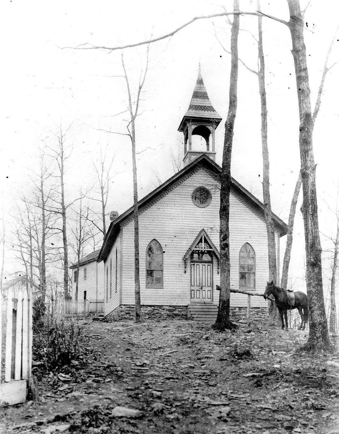 Print, photographic. Calvary Church, Woodbine. B/W copy photo of a small clapboard church in a wooded area. There is a hitching post out front of the church and there is a brown horse tied up there. The church itself has a stone foundation. There is a small single set of stairs, five steps in all, leading up to the front doors. The doors are double doors and have a window above them as well as an overhang that has a white design in the front. There are gothic arch windows on either side of the doors made of what looks to be stained glass. There is a singlular circular window above the doors right below the apex of the roof. Along the roofline there is decorative dental work. This window has an intricate design in it. There is a steeple with a belltower at the front center of the roof. The steeple is layered in multicolors and there is no bell in the space where one should be located. There are three visible windows along the left side of the church. The very top of a chimney is visible above the back left corner. A picket fence surrounds the church yard and can be seen behind the church and then again in the foreground left corner. Another clapboard building is visible behind the church. It has two stories with a window on the front left and a door to the front right with two windows on the second floor. On back in blue ink "Calvary Woodbine." There is a rectangular white label in the center that reads in red ink "Customer Property Order#" The order number is then written in pencil "2524 BA035". 10" x 8"Acquisition