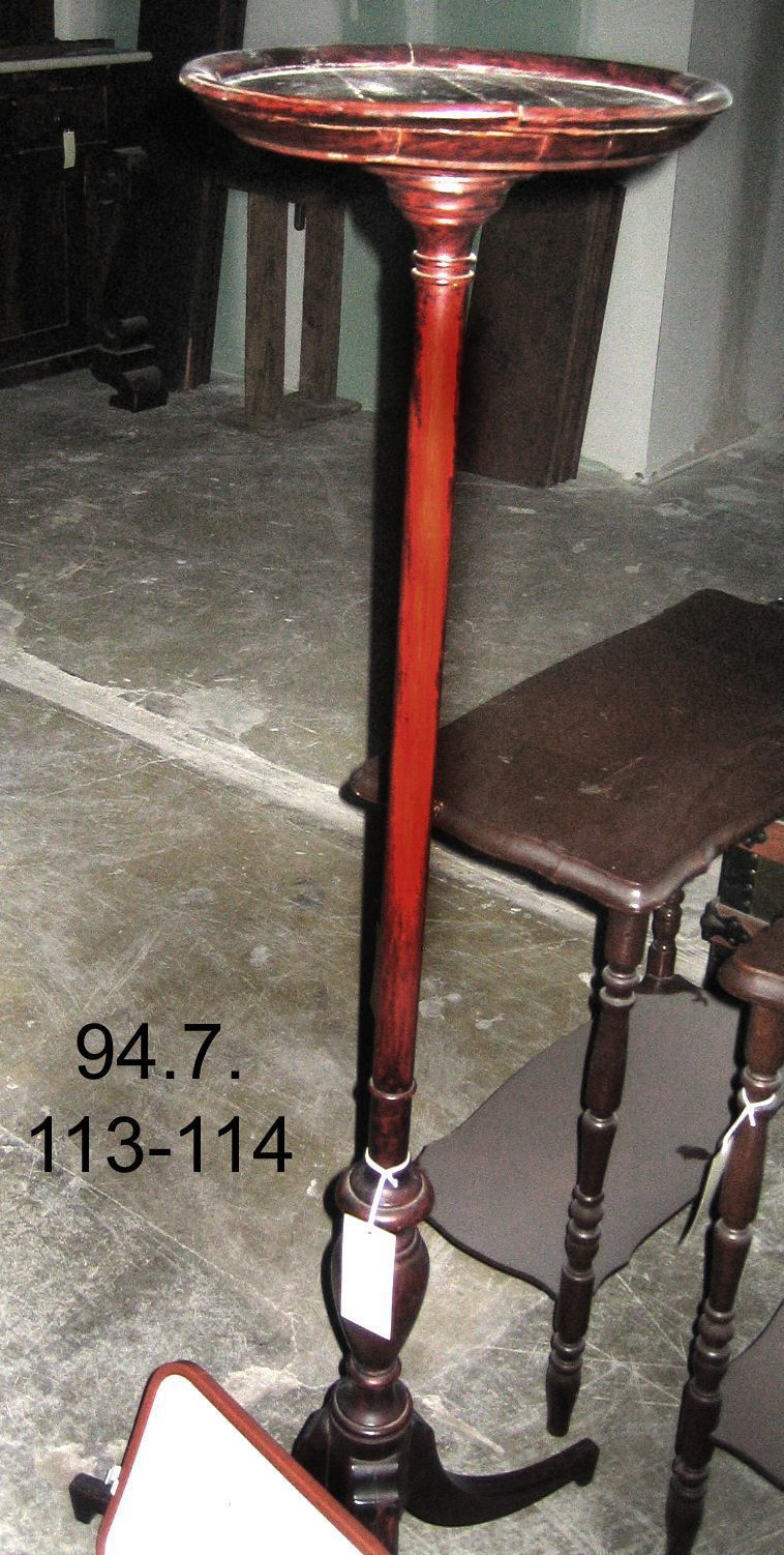 Candlestand. Reproduction neoclassical candlestand has a flat plate at top, slender, dowel-like shaft, a turned urn-shape above the base, and a three - legged pedestal at the base. It measures 46" tall, 20" inches across the base, and 10" across the candle plate. Wood used to construct the stand appears to be oak, but it is heavily grained with red and black paints to lend the appearance of mahogany. A label underneath the candle plate reads "Made in Grand Rapids" and near this the wood is stamped "55". c.1890.Acquisition