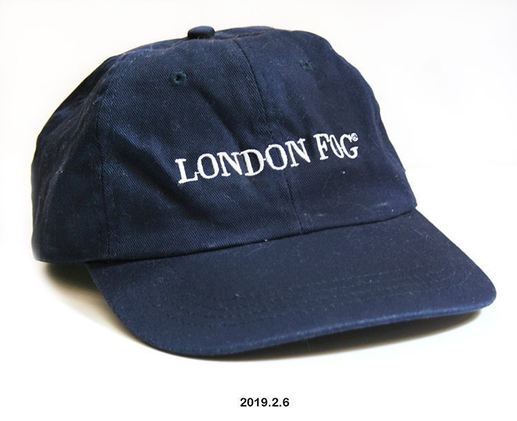 Cap. Baseball style. Dark blue cotton; low crown constructed of 6 triangular panels, each panel has small vent hole; embroidered on front in white LONDON FOG; size is adjustable at back. 4" x 7" x 11". C.2000.Acquisition