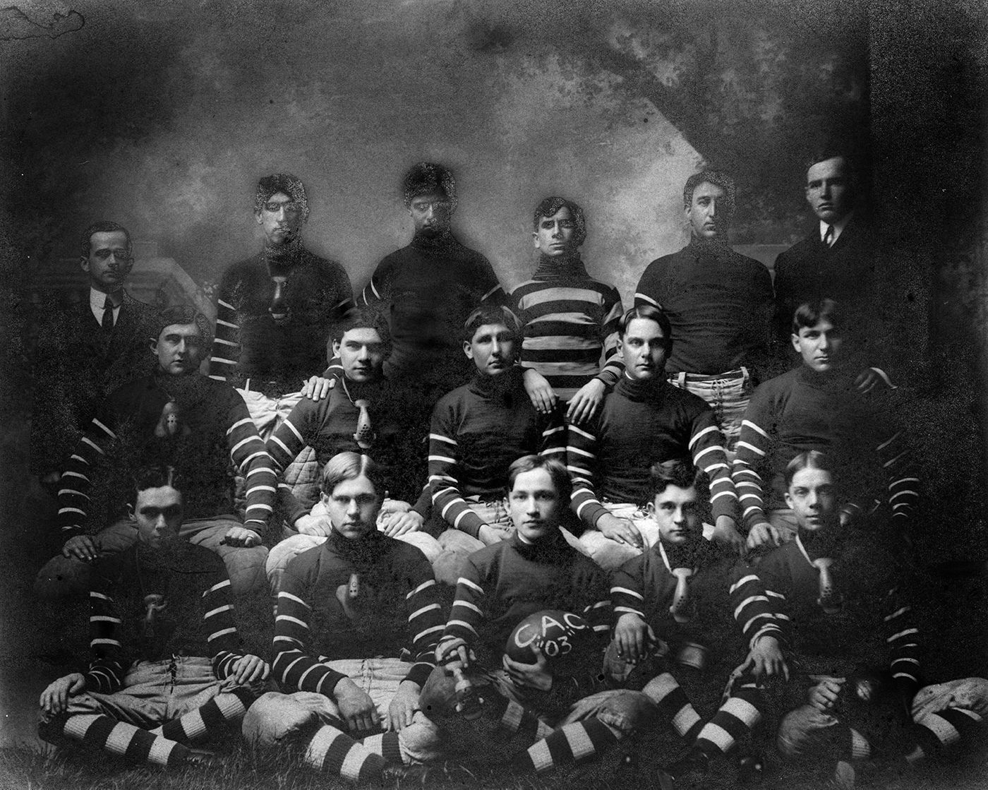 Print, photographic. Carroll Athletic Football Team. B/W on gelatin developing out paper mounted on board. Overall size is 10.5" x 10.5"; image measures 8.75" x 10.5". Produced by Mitchell's Art Gallery, Westminster, Maryland, 1904. Pictured in this photograph are fourteen (14) team members and two (2) managers. Several members of the team have nose guards around their necks. The team member seated in the center of the first row holds a football with the inscription "C.A.C. '03'" on it. The team members and managers are identified by a type-written caption glued to the mounting card: "1904 Carroll Athletic Foot Ball Team. First Row: Geo R. Babylon, Mgr. Holmers, Matthias, Butler, Vanfossen, Irwin. Second ", Diffendal, Kimmey, Zendgraft, Babylon, Erb. Third ", Motter, Ebaugh, Weeks, Babylon, Hook."Acquisition