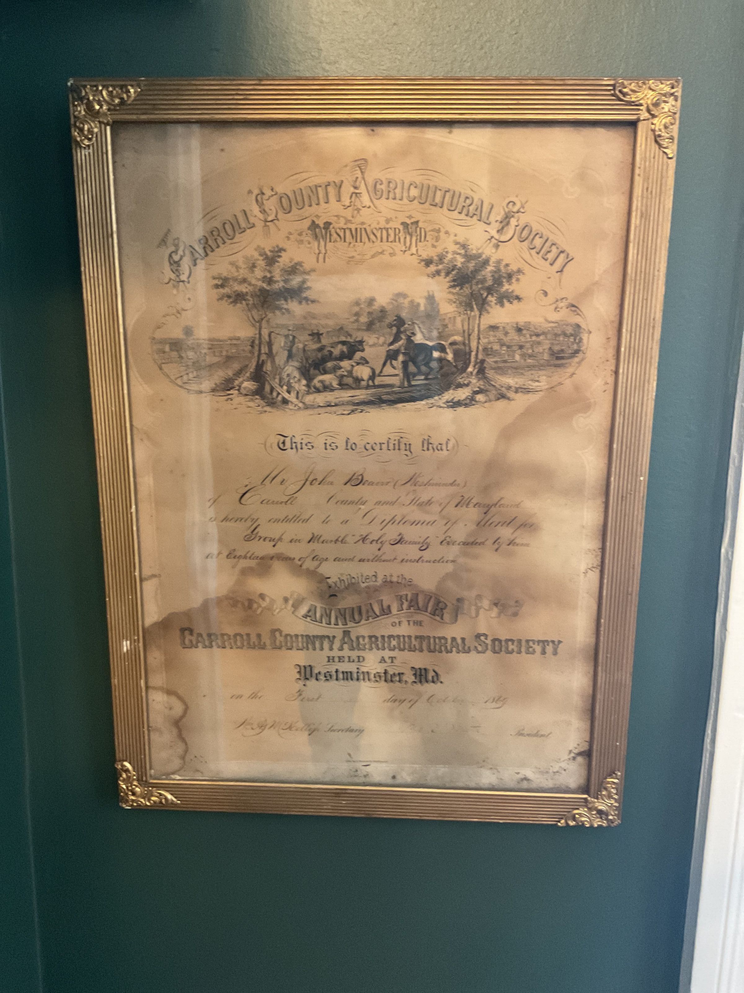 Certificate. Original document stored in orate gold frame with detailing on the corners. Issued by the Carroll County Agricultural Society Westminster MD. Reads “This is to certify that Mr. John Beaver (Westminster) of Carroll County and State of Maryland is hereby entitled to a diploma of Merit for “Group in Marble, Holy Family” Executed by him at Eighteen years of age and without instruction. Exhibited at the Annual Fair of the Carroll County Agricultural Society held at Westminster MD. on the first day of October 1869. Mrs. A. M. Kellih (?) secretary Mr. E. Muth (?) President.”