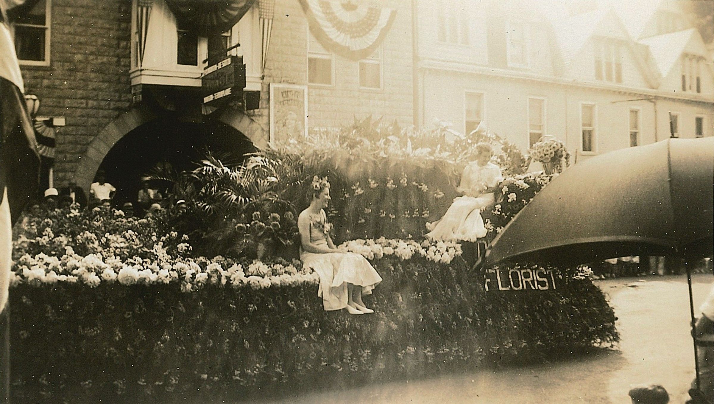 Print, photographic. Carroll County Centennial Parade, Dutterer Florist float, June, 1937. B/W photo. The entire float is covered in flowers. The bottom is covered in dark flowers, white around the middle and then tall flowers all over the top. There are two women in white dresses with flowers in their hair and pinned to their dresses sitting on the float. The side reads "Dutterer Florist" but an umbrella is blocking "Dutterer" Houses and buildings decorated with American flag bunting can be seen in the background. 2.75" x 4.5"