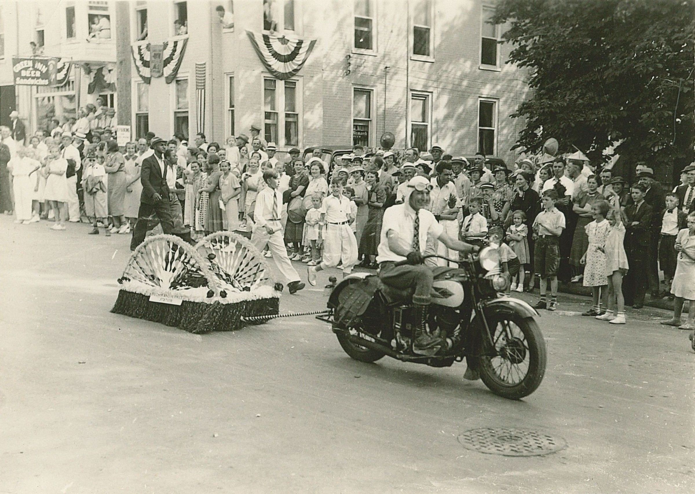 Print, photographic. Carroll County Centennial Parade, Buchman Service Station Float. June, 1937. B/W photo. A young man on a motorcycle wearing a white shirt, tie, and driving hat and goggles is pulling a small float with two spoke semicircles on each side an a sign on it that reads "Buchman Service Station" There are people standing along the street watching the parade and American flag bunting on the buildings. On the building to the right of the street there is a sign that reads "Green Inn Beer Sandwiches" 3.25" x 4.5"