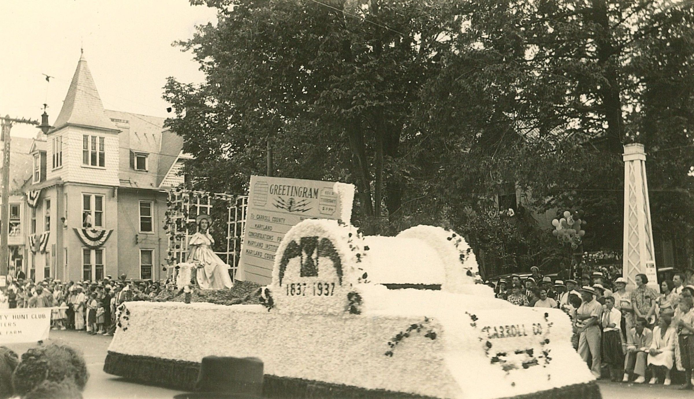 Print, photographic. Carroll County Centennial Parade, Greetingram float, June, 1937. B/W photo. The float is white with rounded edges and flower garland along the edges. The front reads "Carroll Co." There is a sidesways spool shaped piece in the center that has "1837-1937" on it. A girl in 19th dress is sitting below a flowered covered lattice structure at the back of the float and there is a large telegram that reads "Greetingram To: Carroll County, Maryland Congratulations" The sign for the County Hunt Club can be seen behind the float. There are people lining the streets watching the parade. 3" x 4.5"