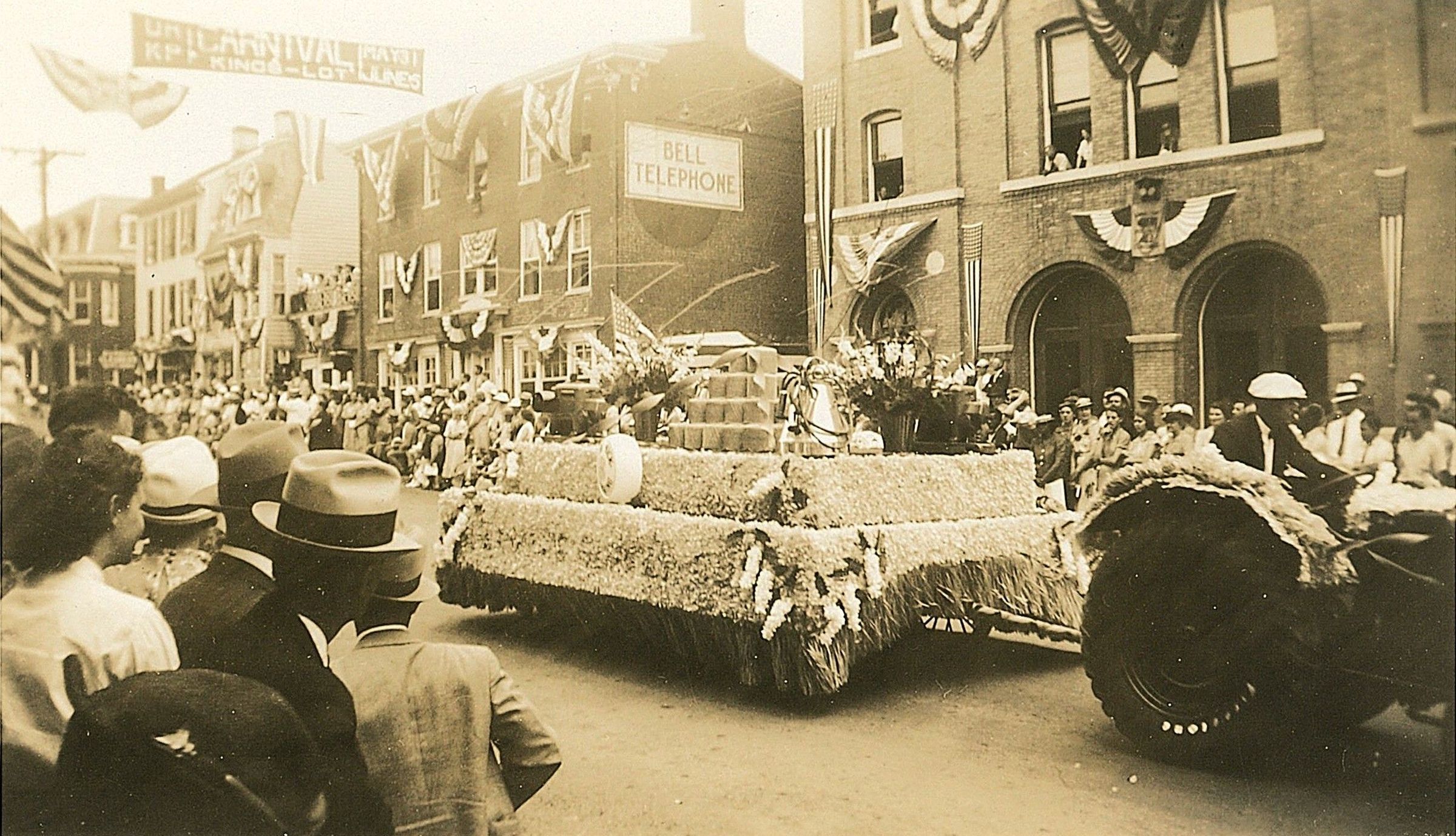 Print, photographic. Carroll County Centennial Parade, unidentified float. June, 1937. B/W photo. Float with fring along the bottom being pulled by a decorated tractor. The float has a stepped display, there are no people on it, it is decorated with boquets of flowers, watering cans, flower pots and loose flowers. There is a circular object on the side of the float sitting at the first step level but it cannot be read. There are people gathered in large groups along the sides of the streets. A banner is hanging over the street that reads "UNKP Carnival Kings-Lot May 31-June 5." A brick building to the left of the road has a sign on it that reads "Bell Telephone." The buildings have American flags and bunting decorating their fronts. 2.75" x 4.5"