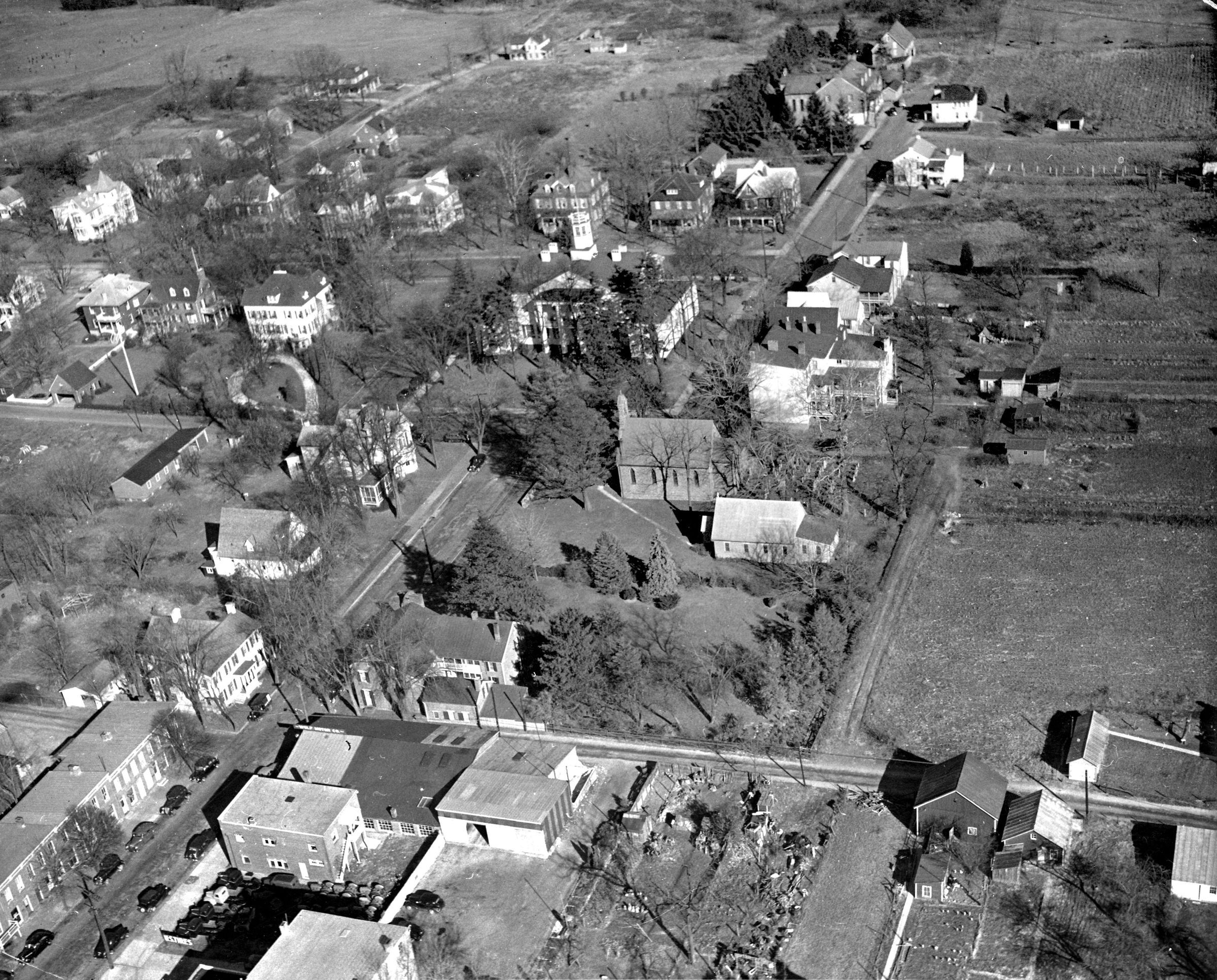 Print, photographic. B/W silver gelatin print, 8" x 10". Aerial view of the Courthouse and surrounding area, 1945. Written on reverse is "air view of Court and Willis Streets area Parke 1945".Acquisition
