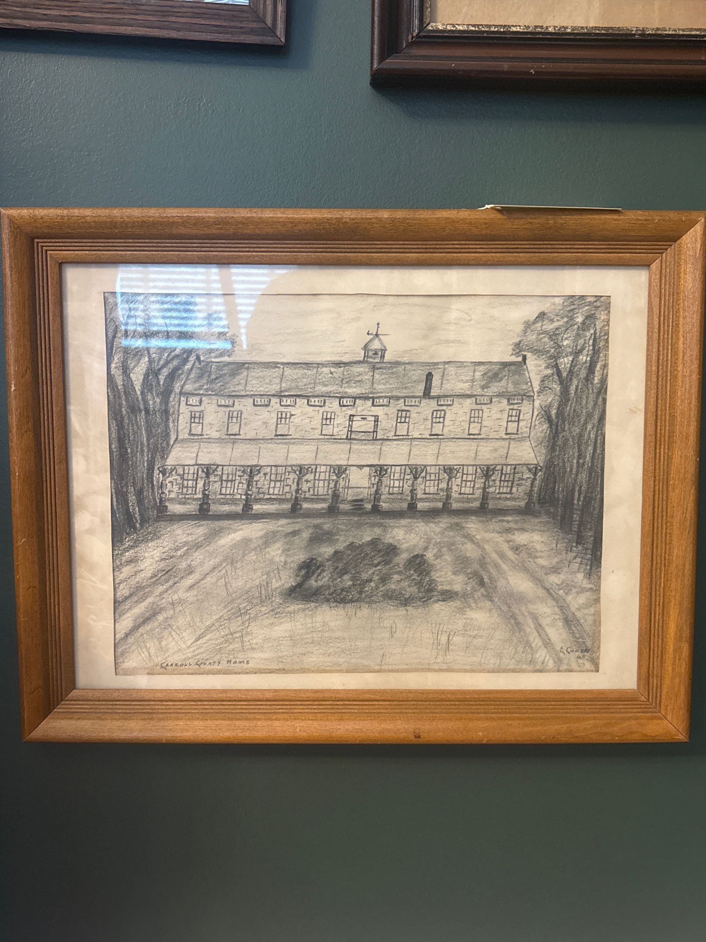 Drawing. Rectangular wood frame. Pencil-on-paper of long building with porch. Caption "CARROLL COUNTY HOME." Signed "E. COHEN 65." 14"h x 18"w x 1"d.Acquisition
