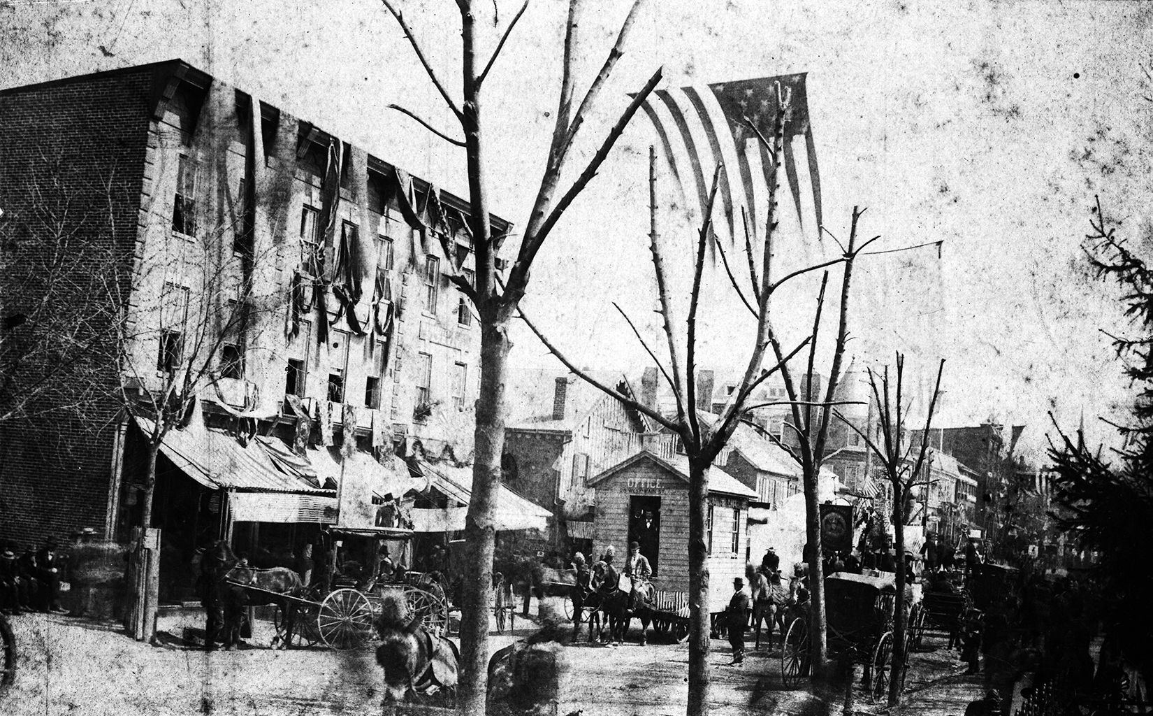 Print, photographic. B/W silver gelatin print, mounted on off-white board, 5.25" x 8.5". Image measures 4.5" x 7.75"; shows the area near the railroad station on Main St. in Westminster during the celebration marking Carroll County's semicentennial, 1887. Written on back is "Note steps down to railroad ____ and west ? 1887 Carroll's semi centennial Lement A. Rush tobacco."Acquisition
