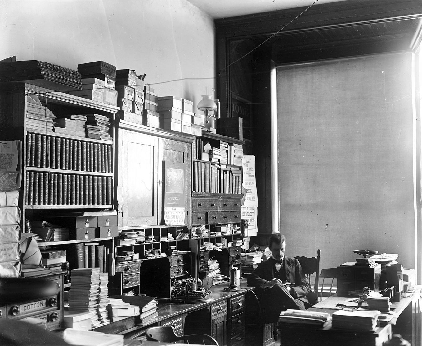 Print, photographic. P.B. Englar, editor, Carroll Record newspaper, in the newspaper office, Taneytown, c.1900. Copy print, produced, c. 1975. Original photographer: Ed Zepp. Process: Glossy Silver Gelatin DOP. Englar is sitting at the desk writing on a clipboard. The desks around the him are covered with various stacks of papers. 8" x 10".Acquisition
