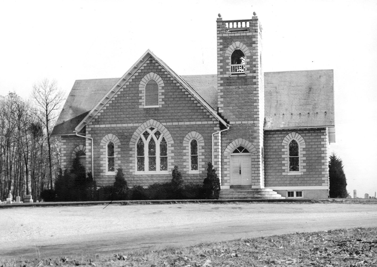 Print, photographic. B/W photo of the Carrollton Church of God. Modern copy print of an earlier photo by John Byers. Dark brick (or stone) building with contrasting light material along the corners, roof line, and around windows and doors; large front gable and central tower. Mounted on white board. Labeled in pencil below photo: CARROLLTON CHURCH OF GOD JOHN BYERS. Written on back “Original by John Byers.” Overall size 8” x 10”; image size 6” x 8.5”.Acquisition