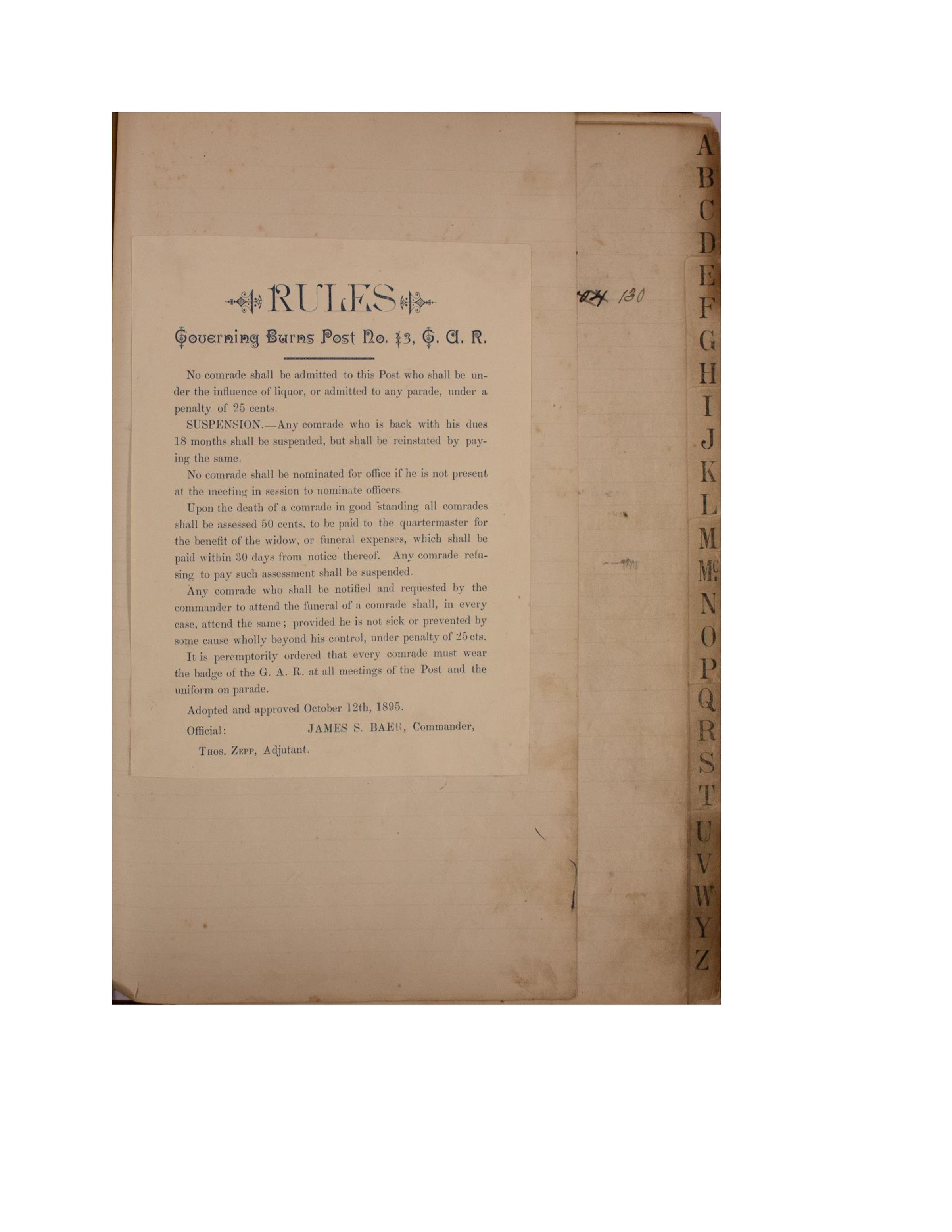 Book, account. Dues book for members of Burns Post, Grand Army of the Republic [G.A.R.] - 1891-1915. Lists names of members and shows dues paid. Usually includes area of County where member lived. Some newspaper obituaries are glued to page. . 187 pages, but missing those from 174-186. Last page with entered information is page 130. Cover: Tan cloth with dark red leatherette corners and binding. Title of book on front of cover - Double Entry Ledger. Scotch taped to spine is small label - "Burns Post #13 - 1891-1915." Also has G.A.R. insignia printed on square of white paper glued to cover. Dimensions: 12.75" x 8" x .75".Acquisition
