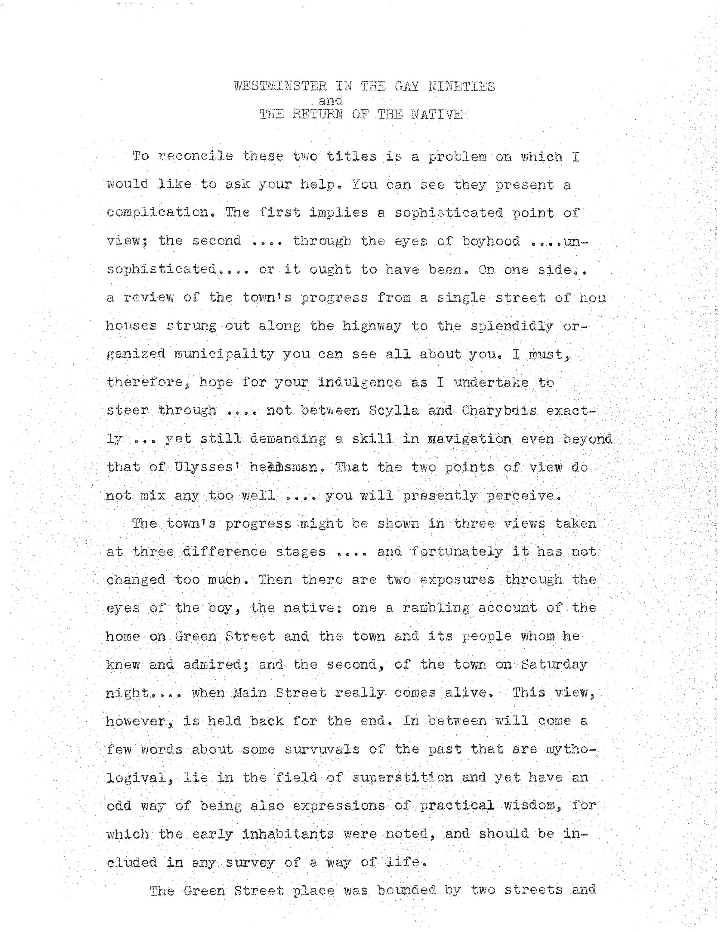 Typewritten manuscript titled, "Westminster in the Gay Nineties and The Return of the Native"