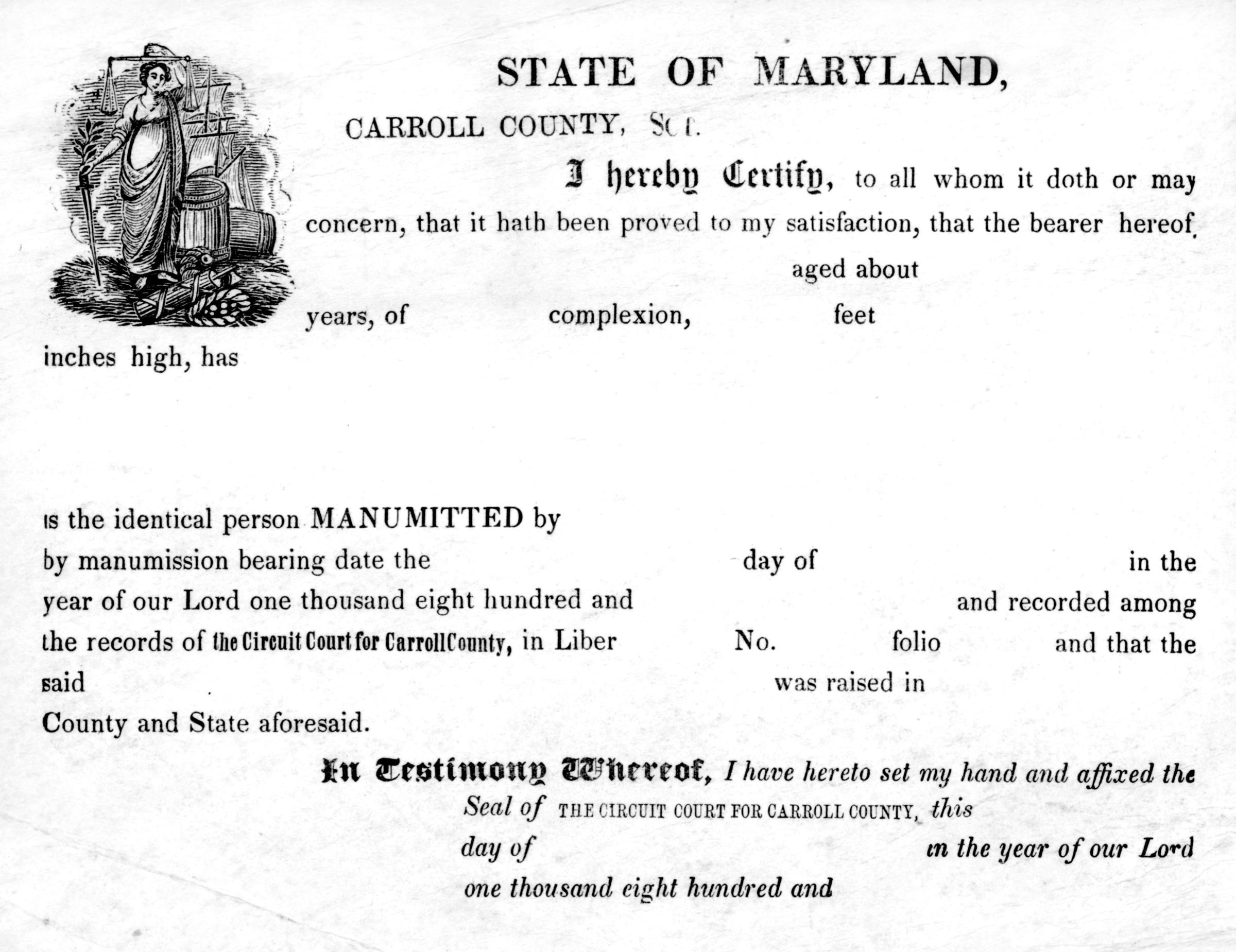 Certificate. Manumission. Blank printed form to be completed for the manumitting of an enslaved person, State of Maryland, Carroll County. Includes spaces to fill in name, age, complexion, and height. 6" x 7.5"General Notes
