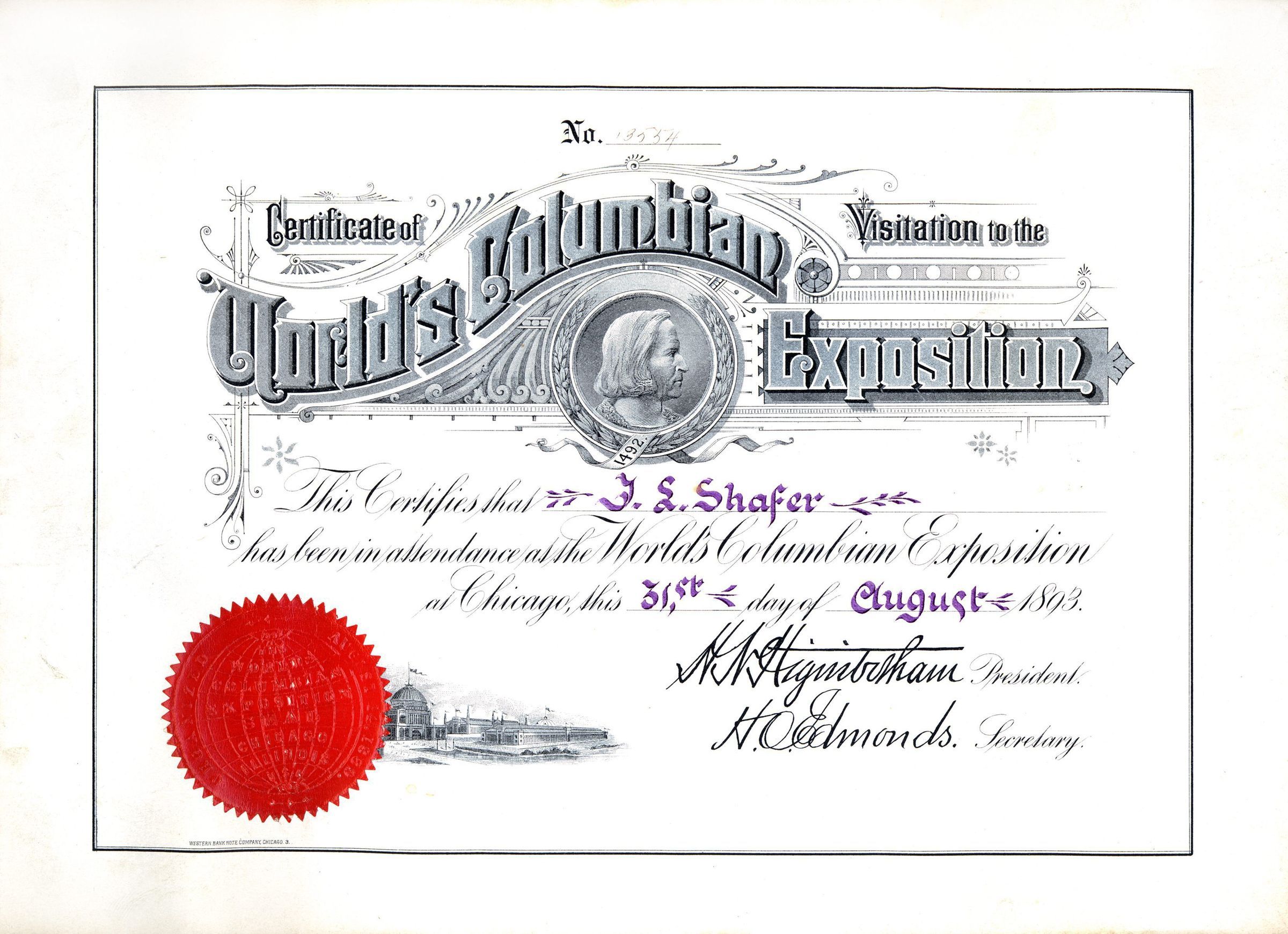 Certificate, attendance. Issued to J. L. Shafer for attendance at the World’s Columbian Exposition of 1893 in Chicago.Acquisition