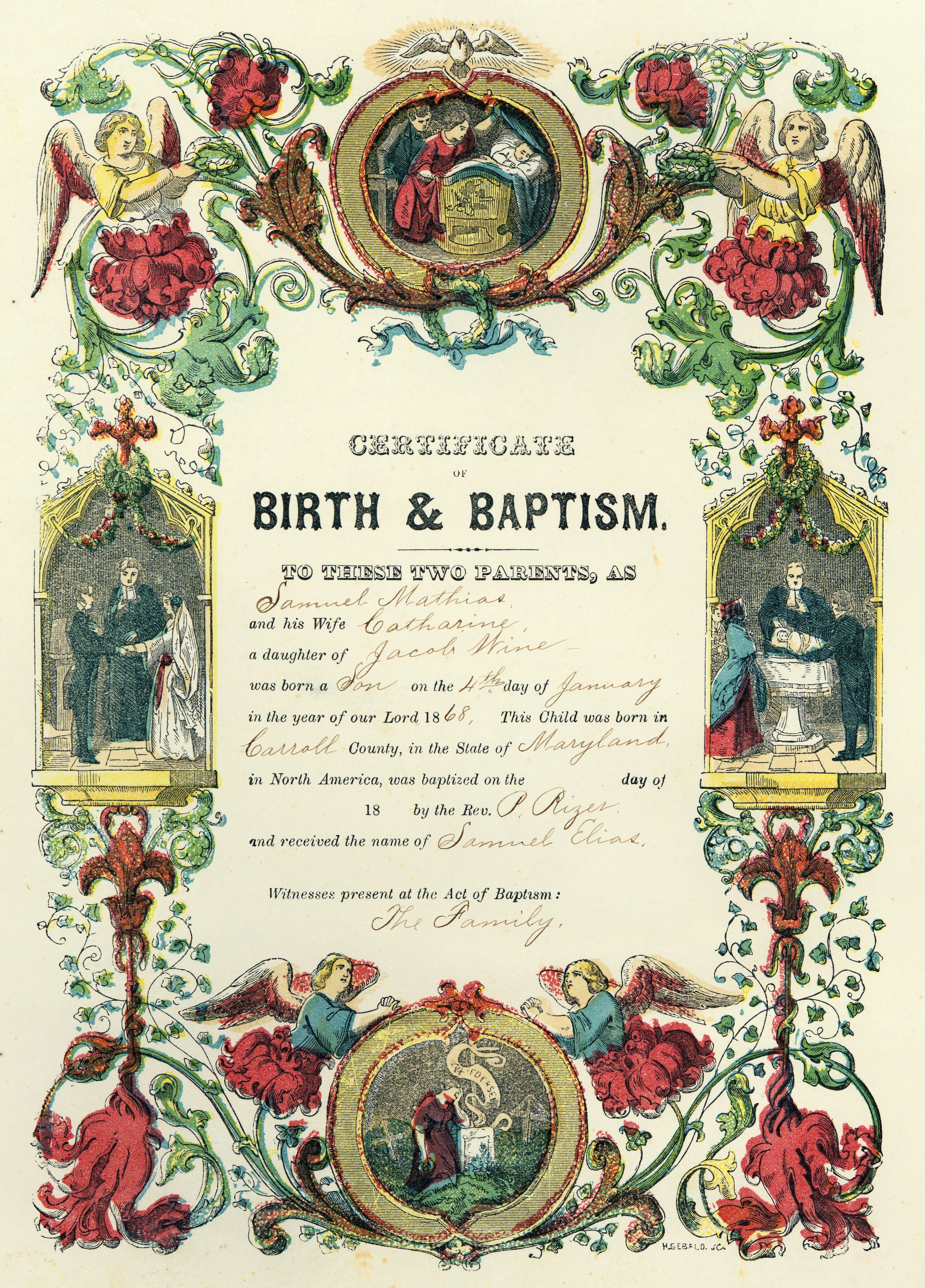 Certificate, baptismal. "CERTIFICATE OF BIRTH & BAPTISM TO THESE PARENTS, AS Samuel Mathias and his wife Catharine a daughter of Jacob Wine was born a son on the 4th day of January in the year of our Lord 1868. This Child was born in Carroll County, in the State of Maryland in North America, was baptized on day of 18 by the Rev. P. Rizer and received the name of Samuel Elias. Witnesses present at the Act of Baptism: The Family." At top is drawing of parents watching over a baby in a crib; drawing flanked by two angels. At center, flanking text, are drawings of a wedding (on proper right) and a baptism (on proper left). At bottom is drawing of woman in a cemetery. 14"h x 10.75".Acquisition
