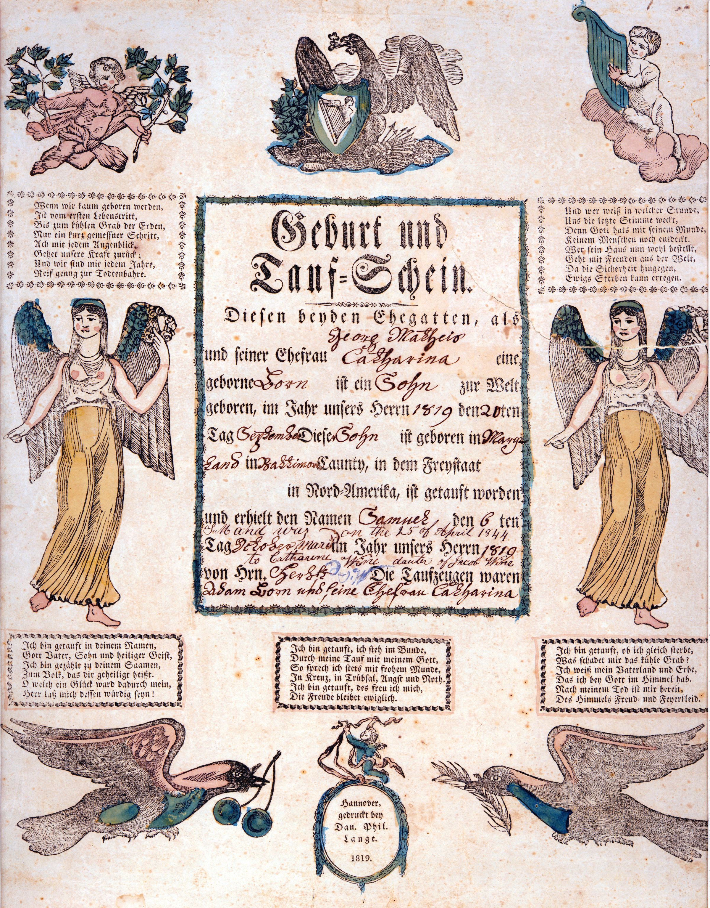 Certificate, baptismal. Fraktur/taufshein. Pennsylvania-German certificate; has central panel reading _____; panel flanked by pair of angels. At top center is American eagle; flanking eagle is pair of cherubs. At bottom are two birds, one with a branch in its mouth, the other with two cherries. Five smaller panels have verses. All printed in German. Dated 1819; “and was married on 25th of April 1844 to Catharine Wine daughter of Jacob Wine” has been written in English between the lines. Appears to be hand-colored. 16"h x 13"w.Acquisition