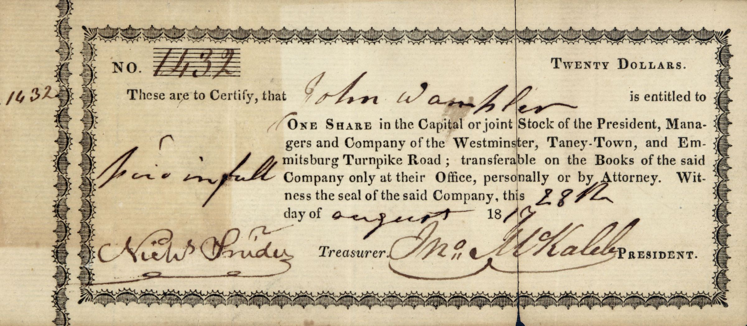 Certificate, stock. Westminster-Taneytown-Emmitsburg turnpike. John Wampler, Aug. 28, 1817. White paper, black printing, 3.5"x 7.5".