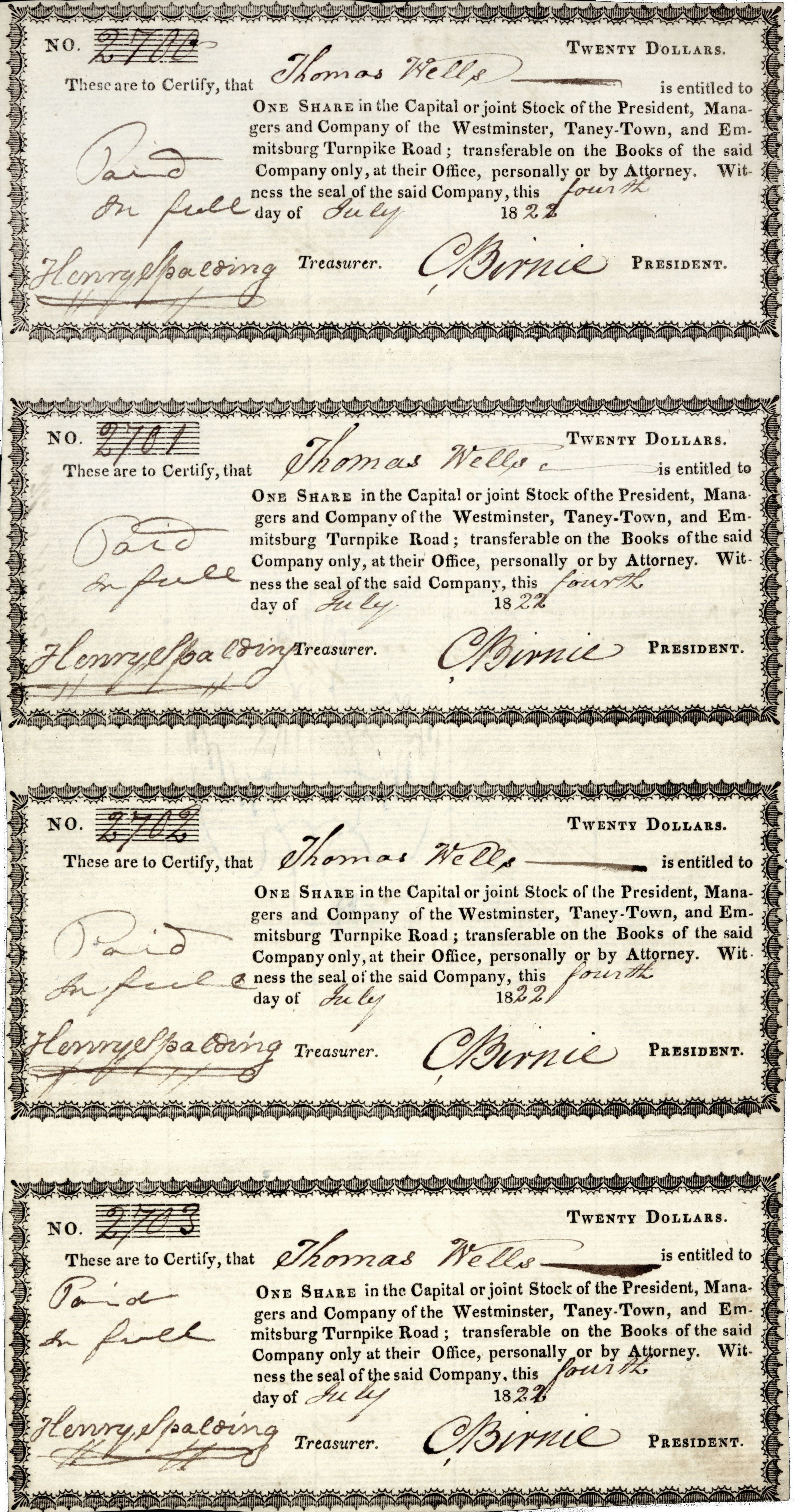 Certificate, stock. Shares in Westminster, Taney-town, and Emmitsburg Turnpike Road for Thomas Wells. Four $20 certificates on one sheet, numbered 2700-2703. White paper, black printing, 12"x 6".General Notes