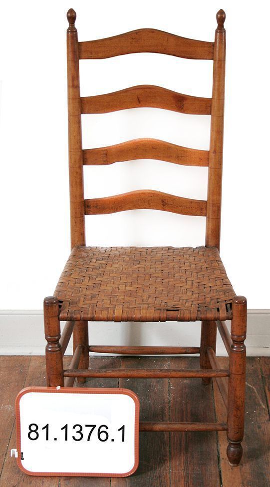 Slagenhaupt Chair. Ladder back with four curved slats. Oval finials on straight rear posts, turned front legs, splint seat. Two stretchers on front and sides, and on stretcher on back. 38.5"h x 17.5"w x 15"d.Acquisition