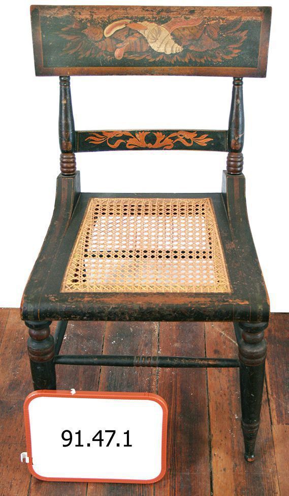 Chair. Empire style, klismos side chair, cane seat, original black paint and polychrome and gilt stenciled seashells and foliage on crest rail; gilt stenciled foliage on stay rail. Short tapered stiles with gold stretched heart design, and cluster of ring turnings. Cane seat, rounded elbows, wide painted lines on side rails. Turned and tapered front legs with ball foot. Front stretcher with ring turning in center, and one plain spindle stretcher on each side and the back. 31.5" x 17.125" x 18". Baltimore, Md., 1820-1840.Acquisition