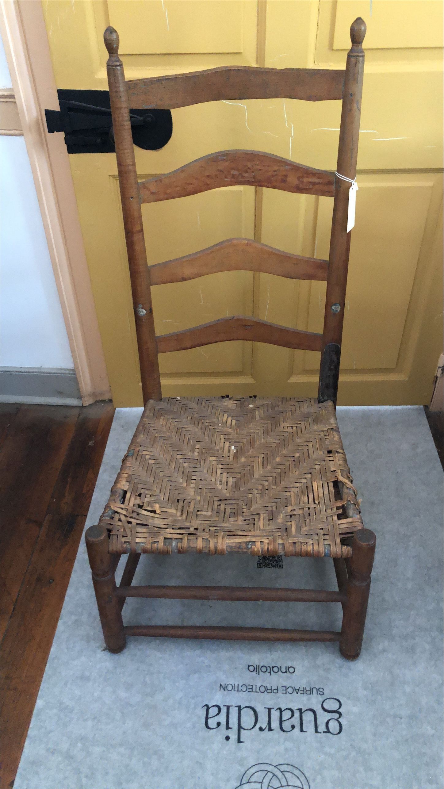 42"h x 20"w x 20"d. Ladderback (4 curved rungs), splint seat. Pointed egg finials on stiles. Low seat. Two stretchers on front and sides, one stretcher on back. [was originally blue - has been stripped] Possibly made by Slagenhaupt.