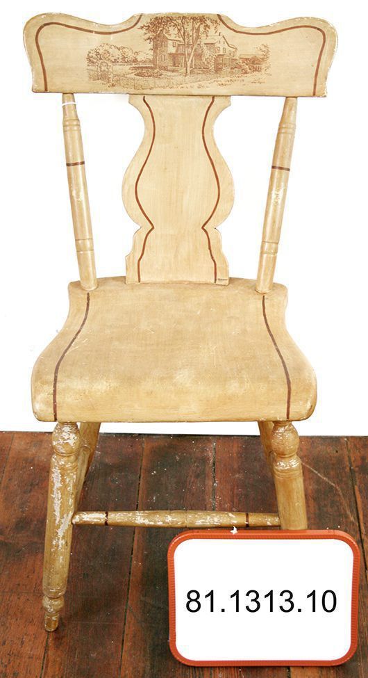 Chair, dining. One of six. Side chair. 32.25"h x 15.5"w x 15.5"d. Painted cream with thin brown banding painted on shoulders, splat, stiles, seat and stretchers. Farm scene handpainted on crest rail in brown. Rectangular crest rail with S-curve shoulders, vase-shaped splat. Rounded stiles and legs with tapered ends. Wedge seat with S-curve sides and rounded front edge. One stretcher on front, back and both sides.Acquisition