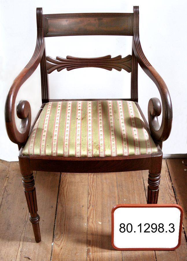 Chair, dining. One of seven. A: Armchair. 33"h x 23"w x 22"d. Rectangular crest rail, ridged stiles extend past crest rail, bow-like stay rail, large curlique arms. Turned front legs, slightly tapered and slightly curved square back legs. B: Seat. 1.5"h x 19"w x 16"d. Removable, trapezoidal, green and floral pink stripe brocade fabric.Acquisition