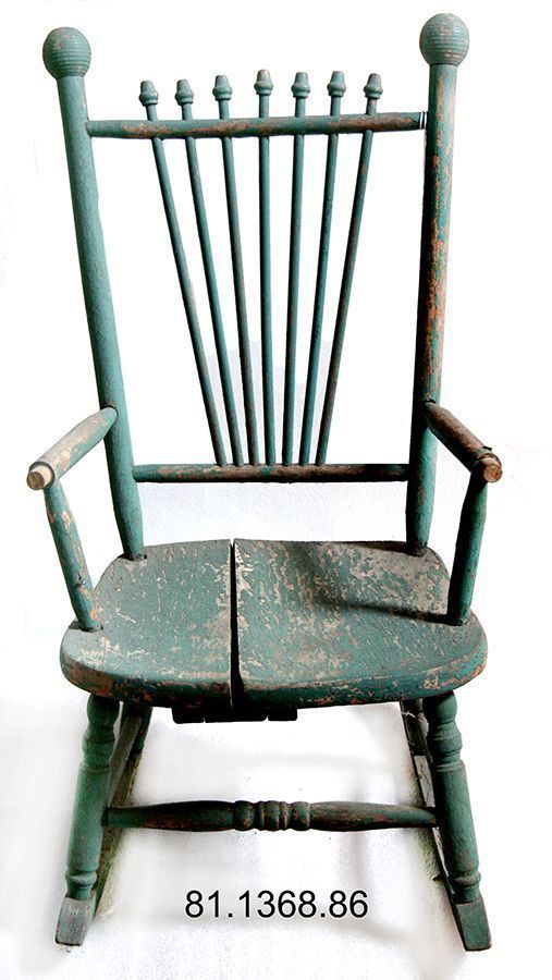 Chair, rocking. 24.5"h x 13.75"w x 19.25"d. Wood, painted light blue. Straight stiles with ring turned ball finials, seven fanned spindles form back with small thimble-like tips. Plank seat, turned front legs and straight rear legs sit on rockers, straight arms.Acquisition