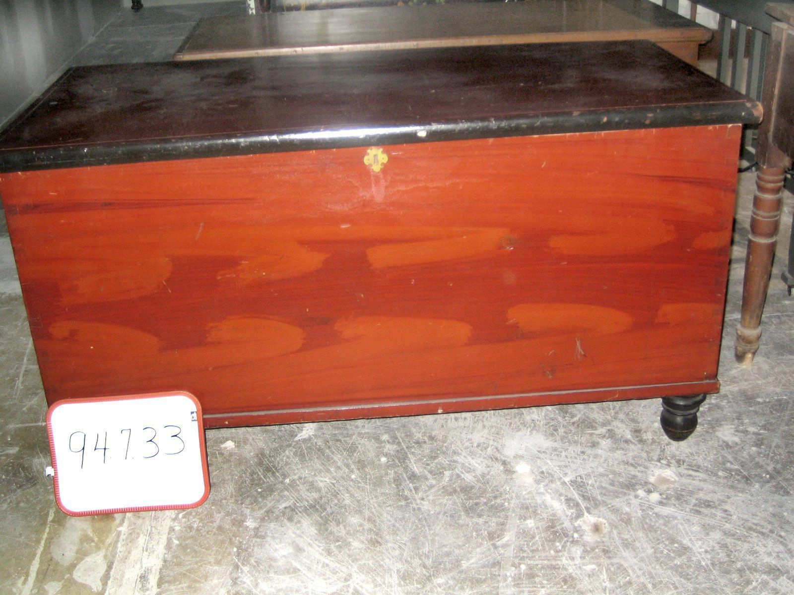 Chest, blanket. Pine, 26.5" x 50" x 24.875". Dove-tailing is evident at the side corners. The wood making up the chest bottom protrudes .25" making a molding-like detail, and the chest lid is bordered by an attached raised molding. Otherwise the chest is flat on all sides. It has ball feet 5" high. The chest has a double hinged lid, and a metal key lock. Part of the lock appears to be missing from the lid's underside. There is a wood lid support arm attached by one screw to the left side interior of the chest. The chest has been painted a dark reddish to blackish mahogany color. 1800-1850Acquisition