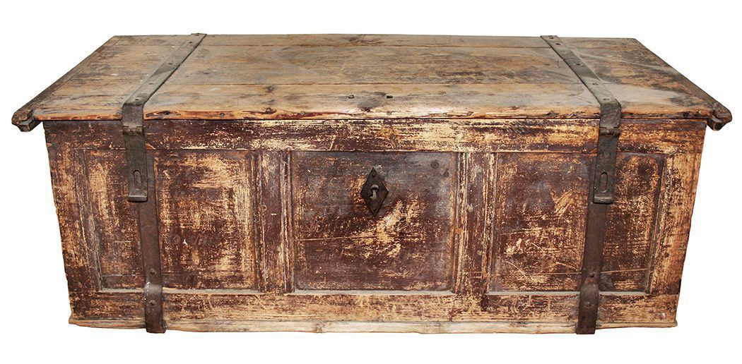 Chest, blanket. Rectangular with hinged lid. Single boards on back and ends; 3 boards on lid. Two iron straps wrap around the entire chest – down the front, across the bottom, up the back and across the lid, ending in to latches. Cast iron handles on ends. Interior has till on proper right side. Lock mechanism is present but does not work. Early 1800s. 17.5” x 45.5” x 22”Acquisition