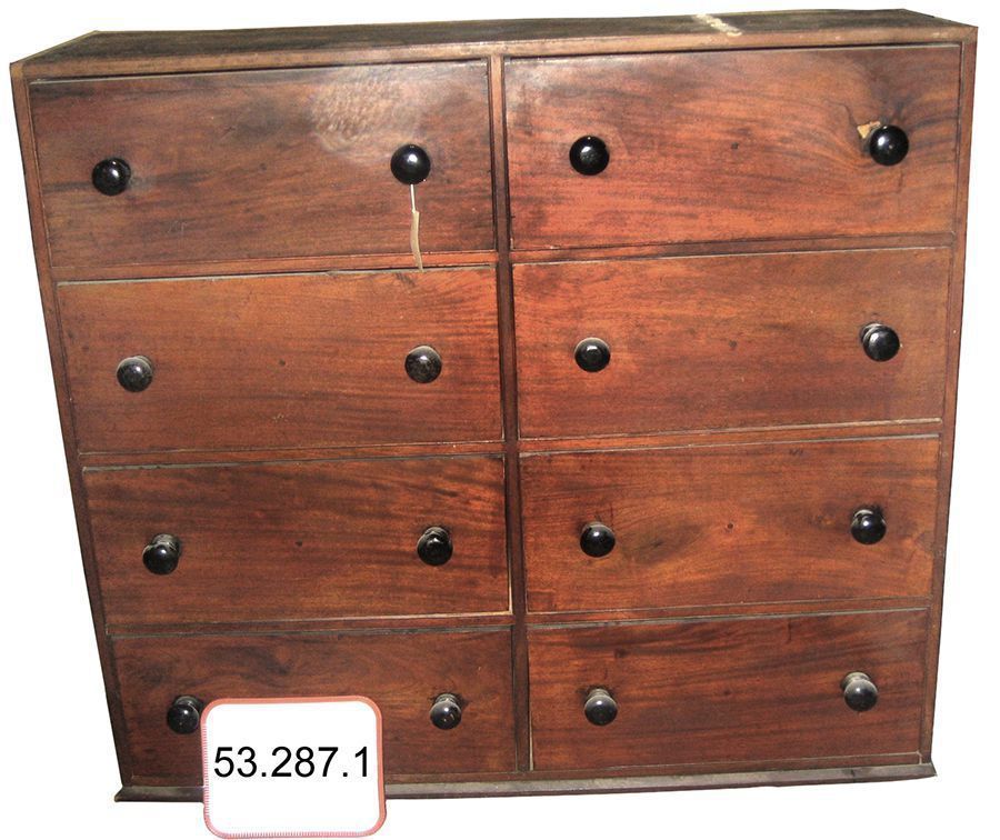 Original deed of gift reads "Chest of Drawers - belonged to Dr. Samuel L. Swarmstedt Westminster 1840". Typed label found inside drawer: "Chest Belonged to Dr. Samuel Swarmstedt Practiced medicine in Westminster from 1840-1872 Mrs. George Byers donor."