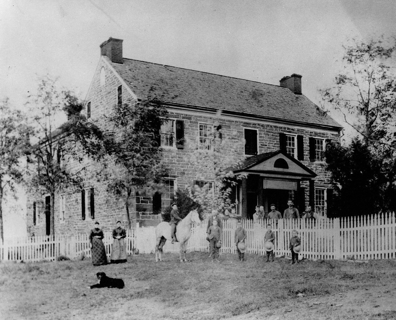 Black and white photograph of "Cinnabar", home of the six family. The photograph features the front and side of the home, the white picket fence on it's perimeter, and the Six Family outside of the house. The photograph also has a geneology and an indentifcation map with it. The photograph is not mounted or matted and measures 8.00"X 9.75".