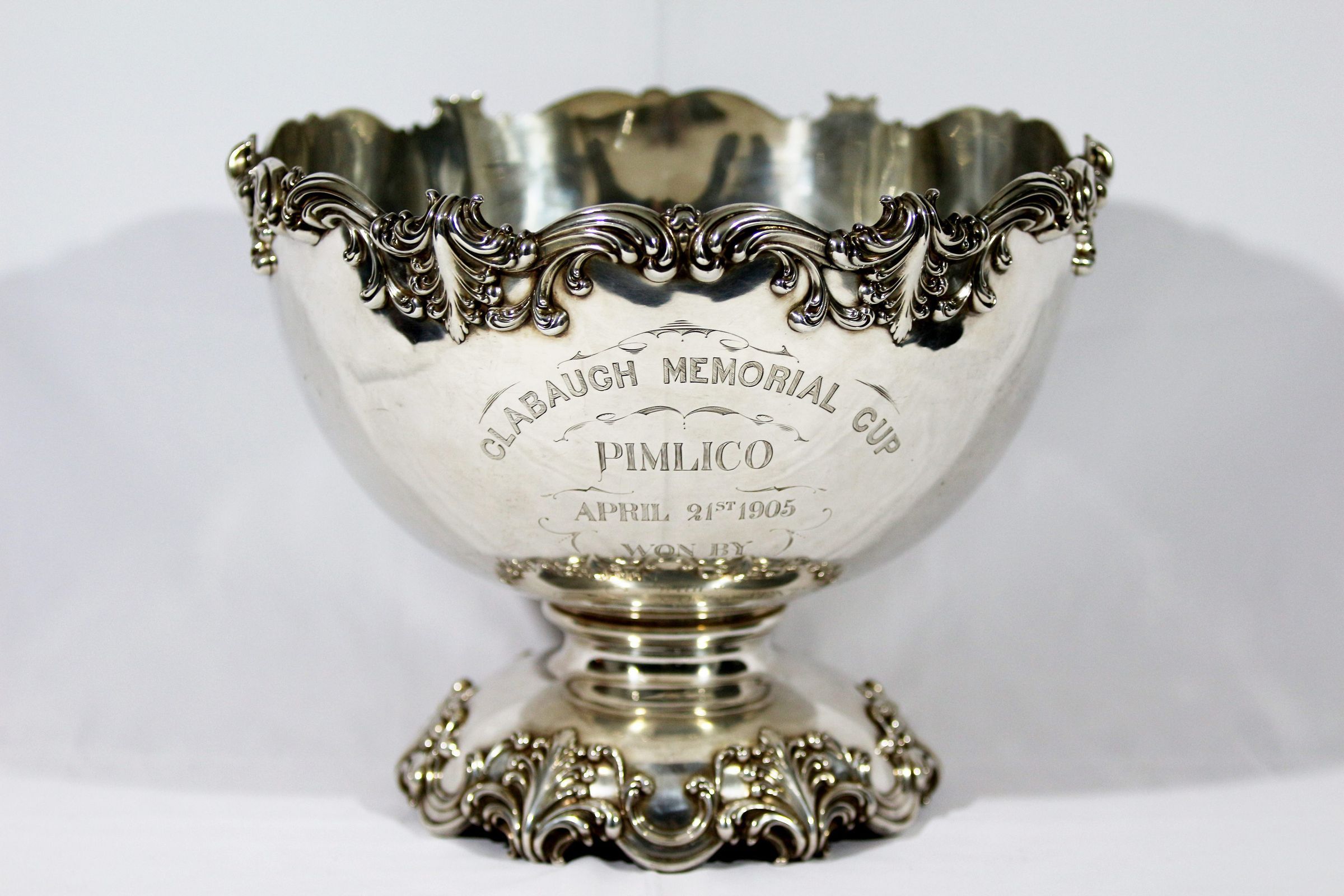 Won by Robert Wyndham Walden [b. August 2, 1843 – d. April 28, 1905] of Bowling Brook Farm, Middleboro, Md. Given to his granddaughter, Thelma Walden (Littlefield) Shriner [b. 30 October 1895 – d. 12 April 1994], (donor) who used it as a punch bowl. HSCC newsletter, Vol. 13, No. 1, January 1963 under the heading "Recent Gifts" lists "Silver punch bowl and ladle, 'Clagbaugh Memorial Cup', Pimlico, 1905, Mrs. Earle Shriner, Union Bridge, donor." Was never accessioned at that time and mistakenly cataloged as part of Hard Lodging donation. Used with 94.7.2 and .3.