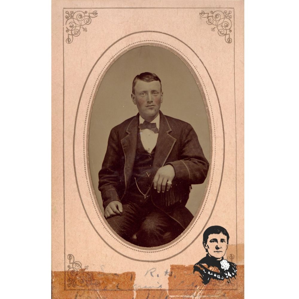 Photo shows a young man, probably in his 20s, in a suit and tie with pocket watch chain and fob visible and a ring on little finger of his left hand. Tinted to add color to cheeks. No identification of photographer. Undated. Overall size 4.75" x 3". Oval opening for insertion of tintype 3.25" x 2". C.1880.Acquisition
