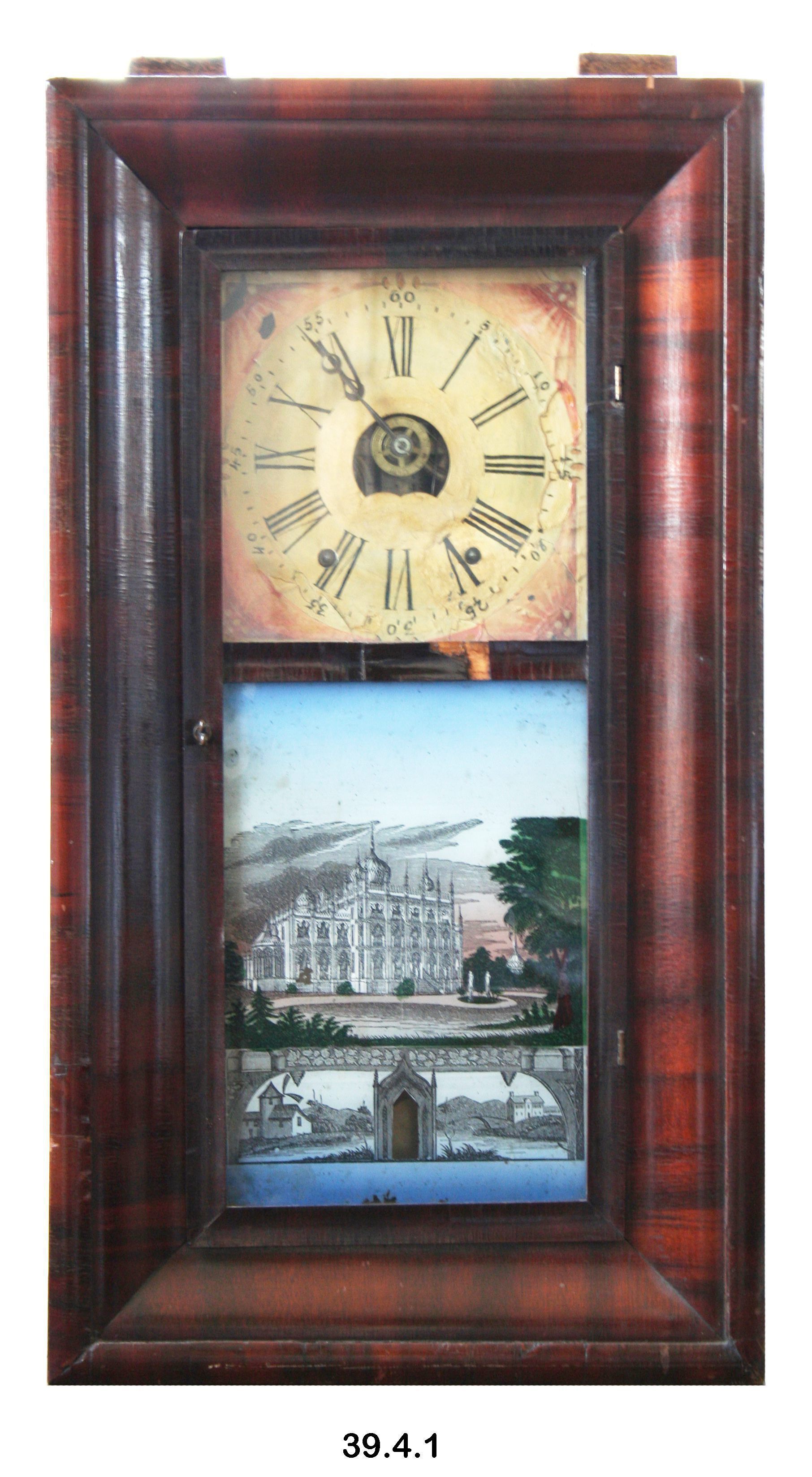 Clock, shelf. Rectangular wood case, rectangular glass door (upper section clear, lower section painted with an Eastern-style palace (according to accession card, building is P.T. Barnum's home "Iranistan") and a bridge with a doorway), clock face is painted orange and yellow with Roman numerals (four is written as IIII rather than IV). 29"h x 16"w x 4".Acquisition