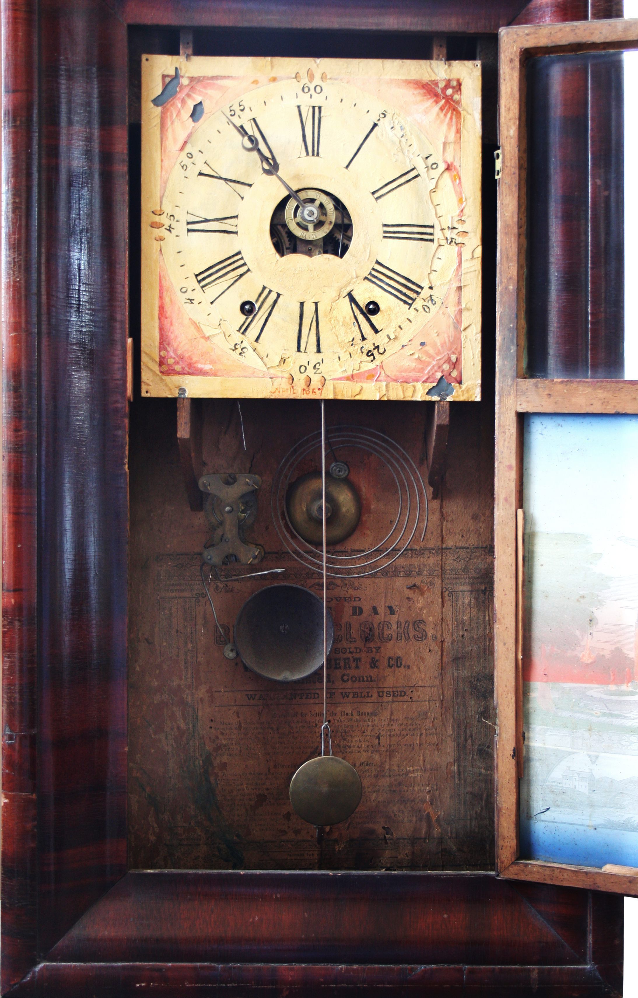 Original deed of gift reads "Mantel Clock made by Wm. Gilbert & Co. Winstead, Conn." Handwritten index card "Clock - Walnut mantle (o.q.) Shellman House Great Room Donor: Mr + Mrs Burrier Cookson Repaired Mrs E. M. Richardson." Hangtag reads "Repair on Feb 7, 1963. CHARGES $14.38. (Back stamped) ___E'S WATCH AND JEWELRY REPAIR TUC ROAD AND RAILROAD AVENUE WESTMINSTER, MARYLAND."