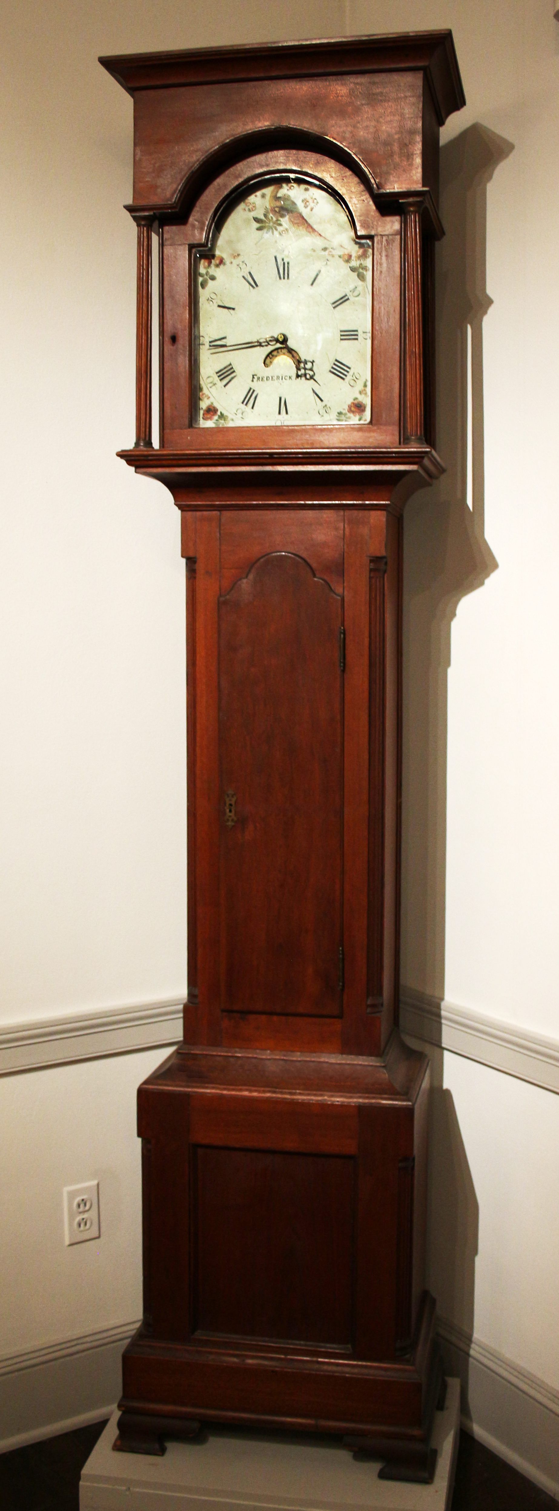 Clock, tall case. Walnut clock measures 91" x 21.5" x 12.5". Front of base is paneled. Corners have quarter-round fluted columns. The base rests on bracket feet. A sloped molding leads up to the shaft of the clock. The shaft is rectangular with a rectangular door. The top of the door has a semicircle shape with a ogee curve below that; this curve is asymmetrical. A pierced brass escutcheon is used at the proper right side of the door. A small panel of veneer is used just above the top of the door. The corners of the waist have quarter-round fluted columns. A sloped molding leads up to the bonnet. The rectangular bonnet has fluted Ionic columns with brass capitals at the front corners; columns at the back corner have no capitals. The front clock face window door is rectangular with a semi-circle shape at the top. The top of the bonnet is squarely finished with a plain molding cornice. There are no finials. A sounding hole is present at the top of the bonnet. Rectangular windows with semi-circle tops are present in the sides of the bonnet. The iron clock face is painted white with Roman hour numbers and Arabic minute numbers. A dial behind the face gives the day of the month in Arabic numbers. Designs of flowers and strawberries are painted in the corners and a pheasant is painted at the top in brown, gray, blue, and pink. "FREDERICK, M D." is painted below the date dial. Brass hour and minute hands are pierced with circles and scrolled. The brass pendulum has only a front face; it has no lead weight in the rear. Two small oblong weights run the clock and are attached with steel chain, most likely not original. Possibly manufactured by John Fessler, Frederick, Md., c. 1810. A: body. B: hood. C: works with weights attached. D: pendulum. E: case key.Acquisition