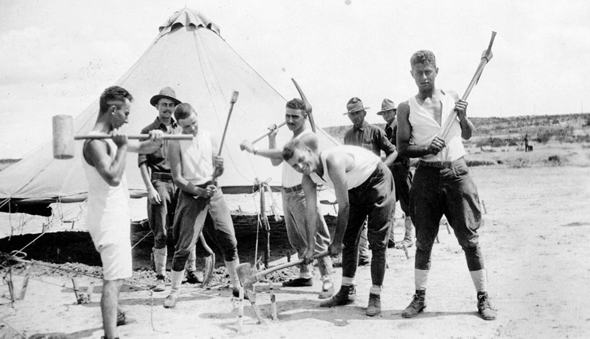 Print, photographic. Co. H, 1st Regiment, Maryland National Guard, Eagle Pass, Texas, 1916. Photographer unknown. Back of photo reads, "The Tent Crew at Work." 3" x 4.5"Acquisition