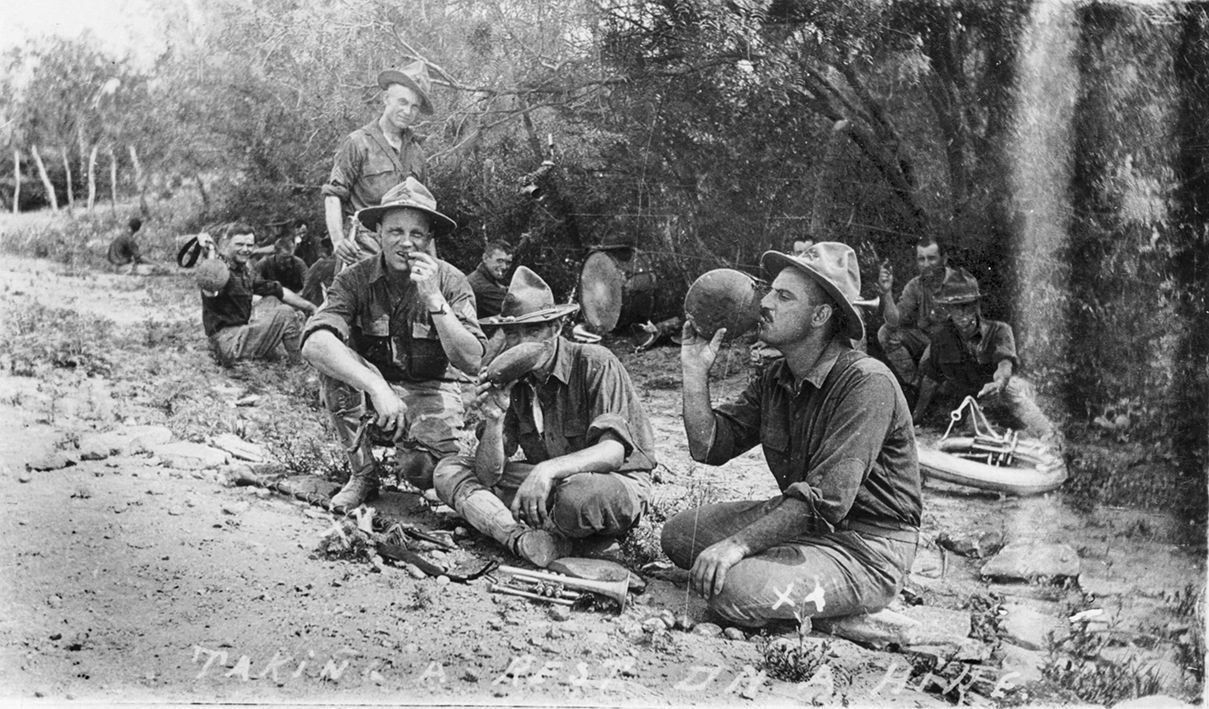 Postcard. Shows men from Co. H, Maryland National Guard at Eagle Pass, Texas, on the Mexican border, 1916. Soldiers drink from their canteens at the Mexican Border in 1916. Photo labeled "TAKING A REST ON A HIKE". Handwritten in blue ink: 1916 Mexican Border. Has address label for Miss Anna M. Heltibridle, 25 John Street, Westminster." 3.5" x 5.5"Acquisition