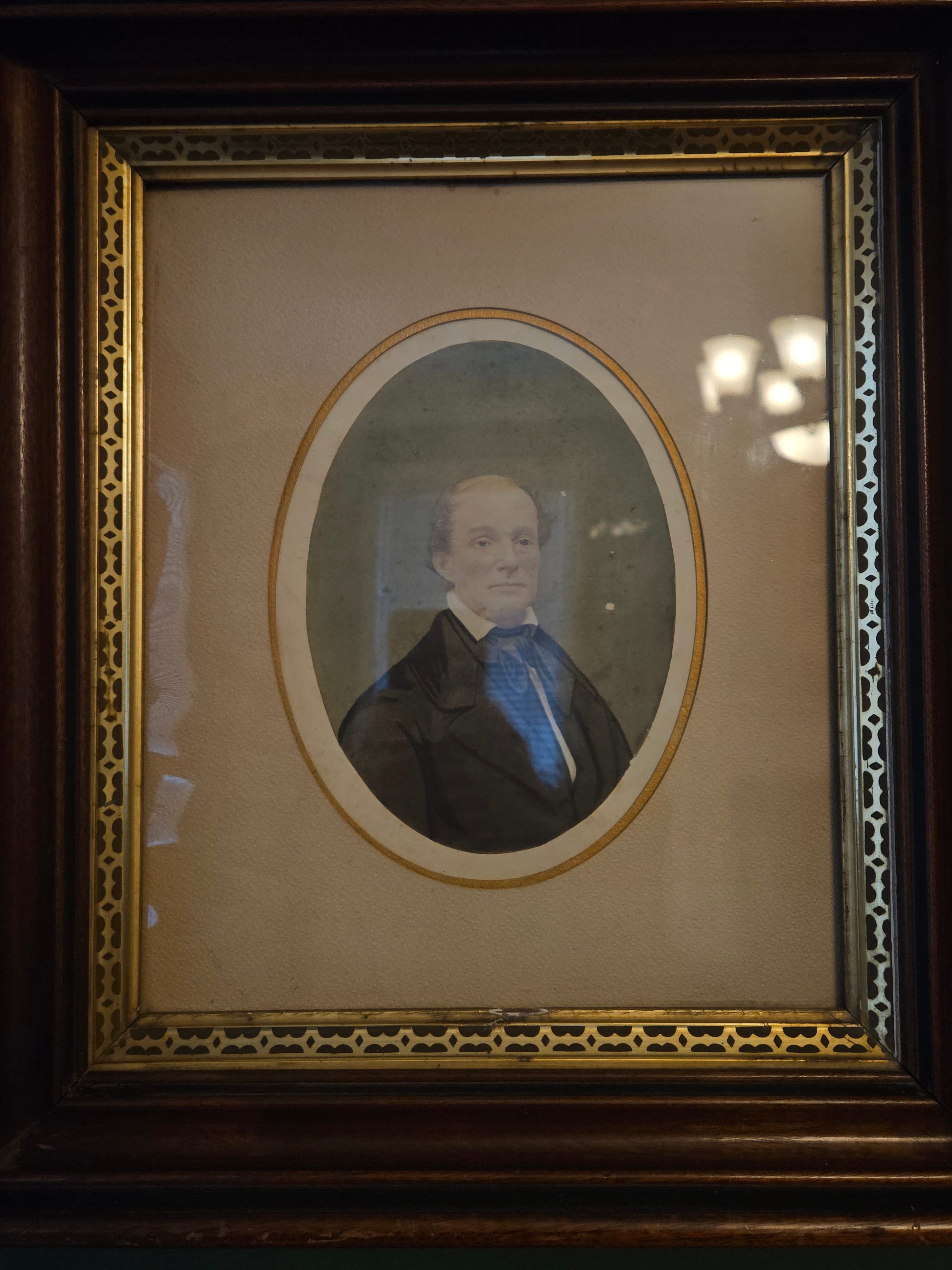 Print, photographic. Mordecai Gist Cockey. Hand-tinted photographic image of man, oval mat. Rectangular wood frame, brass trim with design. 15.5"h x 13.75"w x 2.5"d.Acquisition